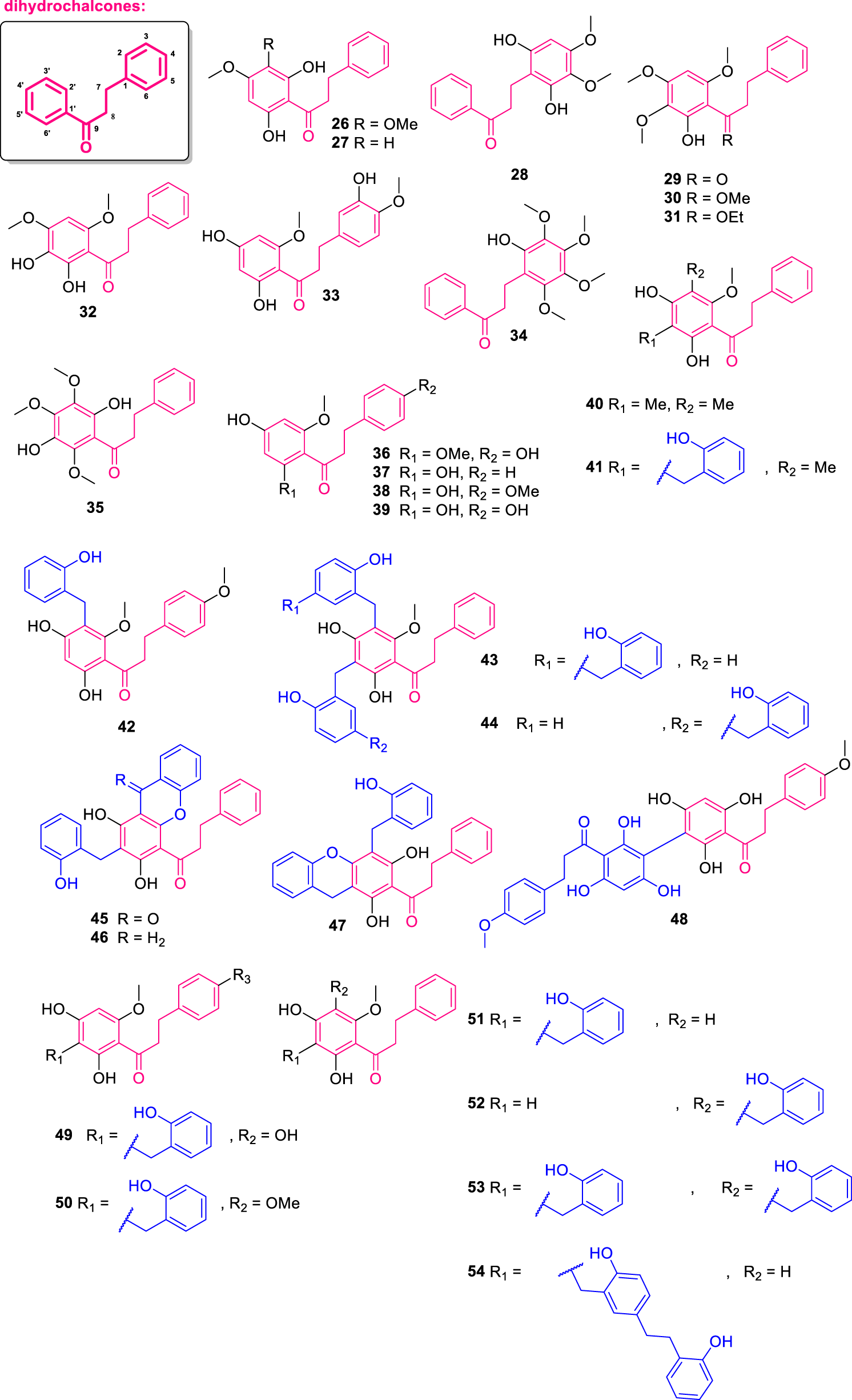 Chemical structures of dihydrochalcones isolated from Annonaceae (26–54).