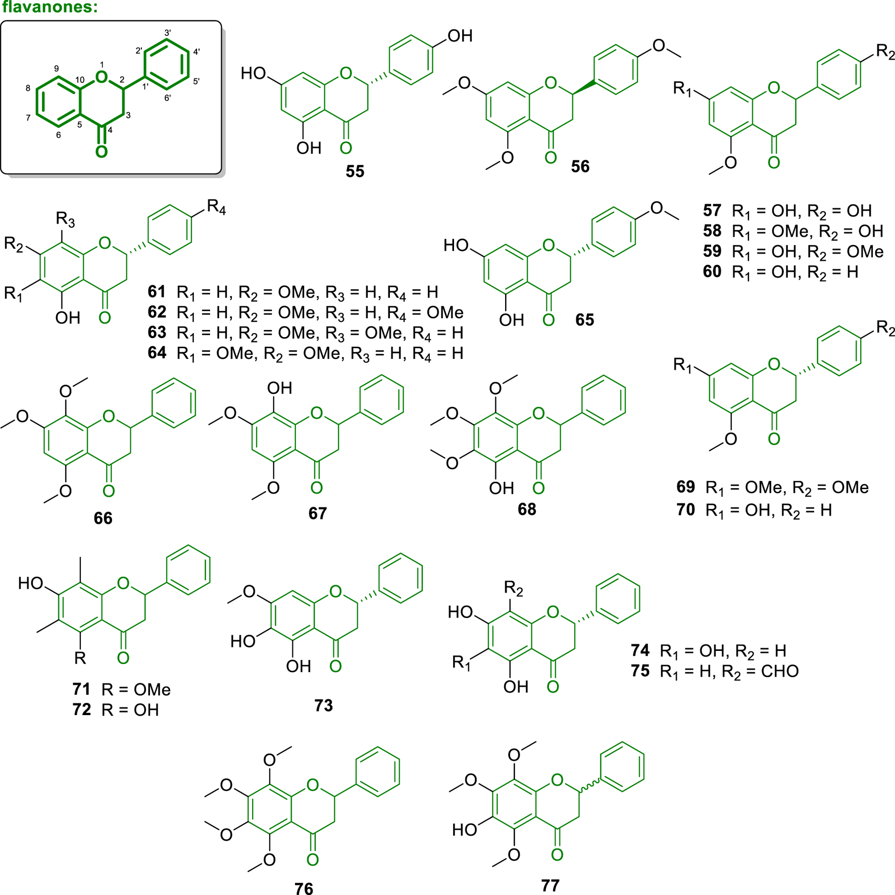 Chemical structures of flavanones isolated from Annonaceae (55–77).
