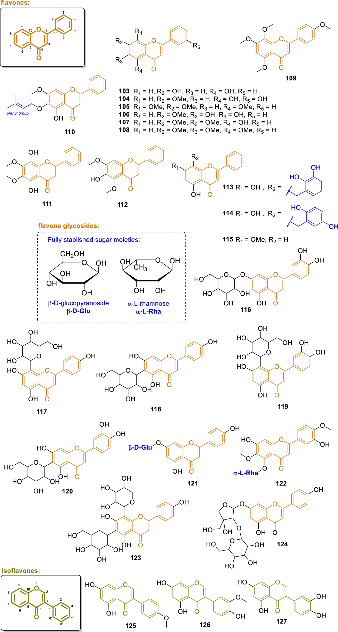 Chemical structures of flavones and isoflavones isolated from Annonaceae (103–127).