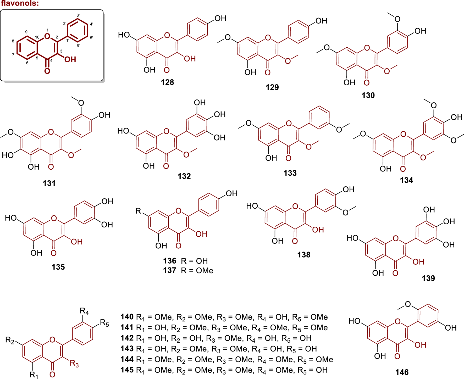 Chemical structures of flavonol aglycones isolated from Annonaceae (128–146).