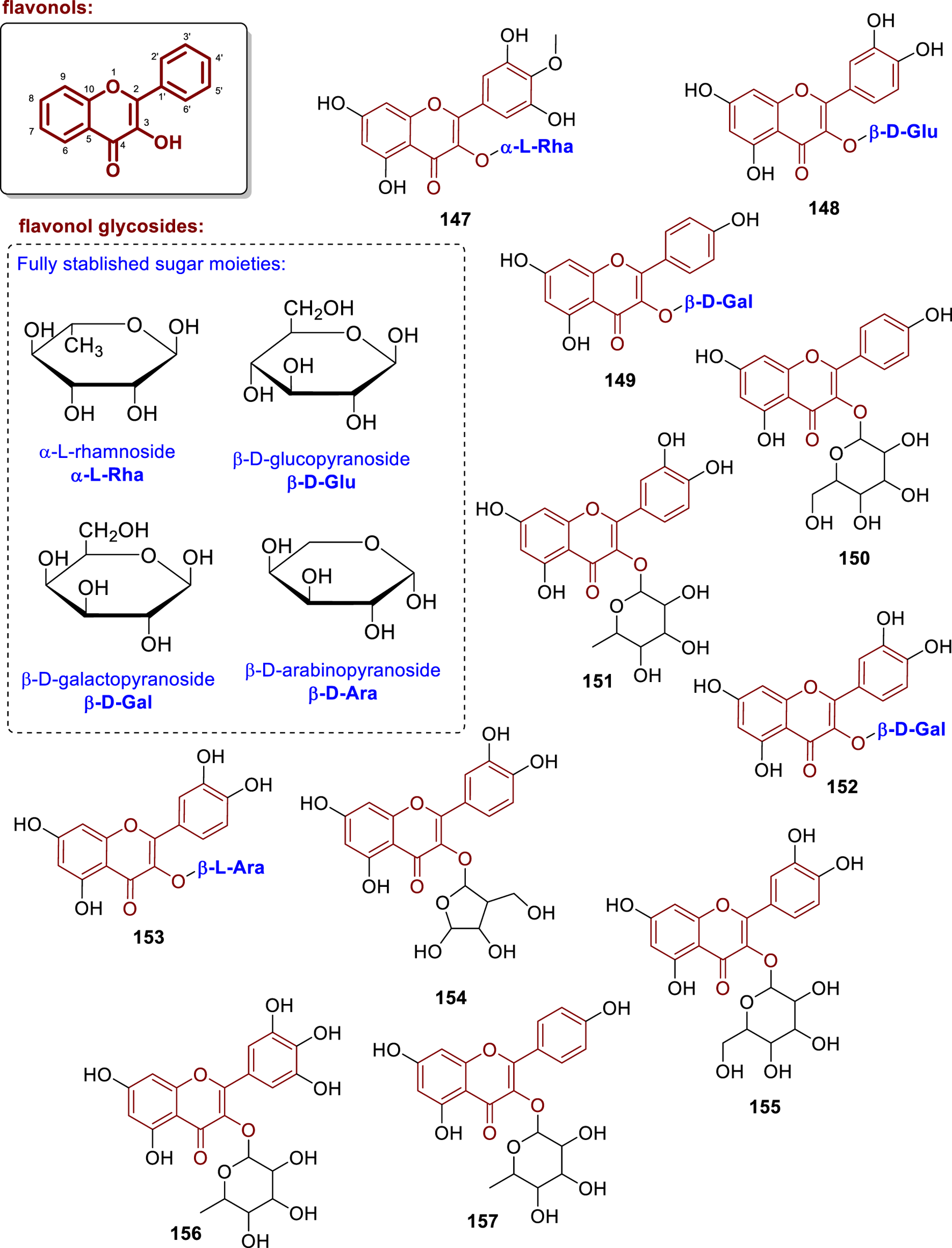 Chemical structures of flavonol glycosides isolated from Annonaceae (147–157).