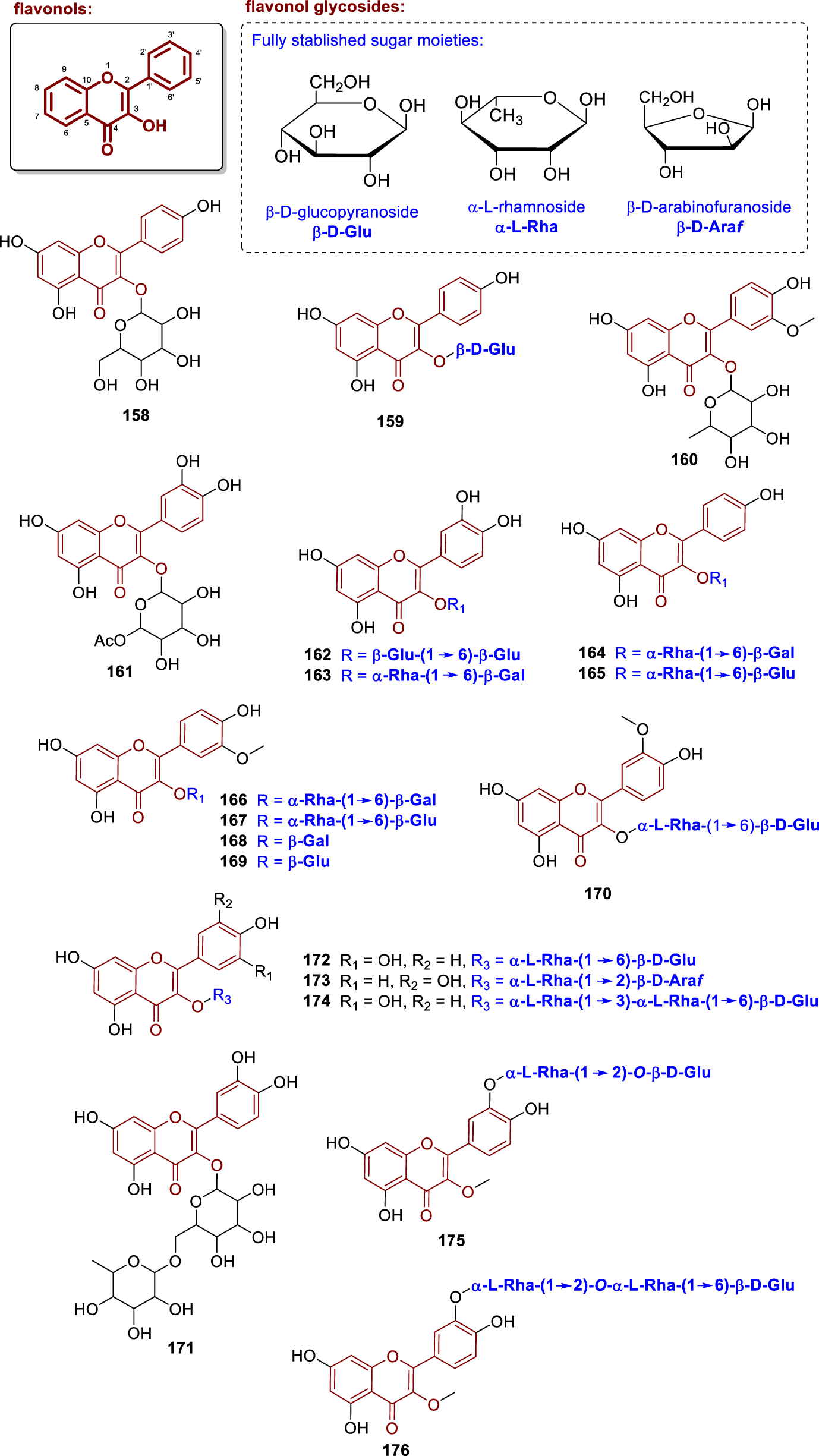 Chemical structures of flavonol glycosides isolated from Annonaceae (158–176).