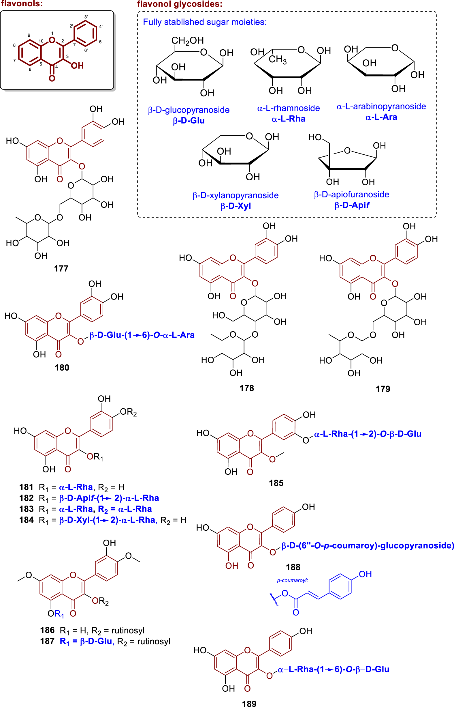 Chemical structures of flavonol glycosides isolated from Annonaceae (177–189).