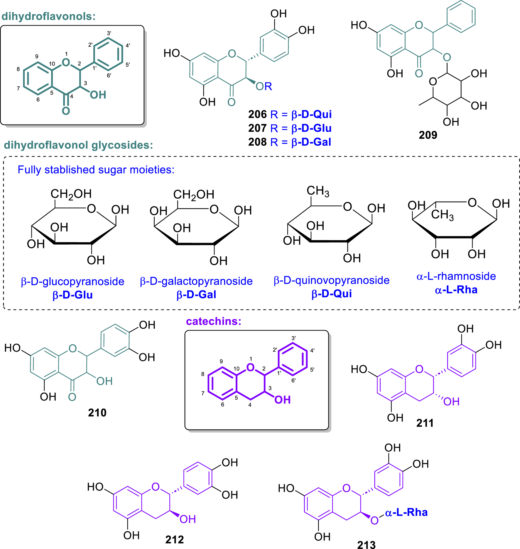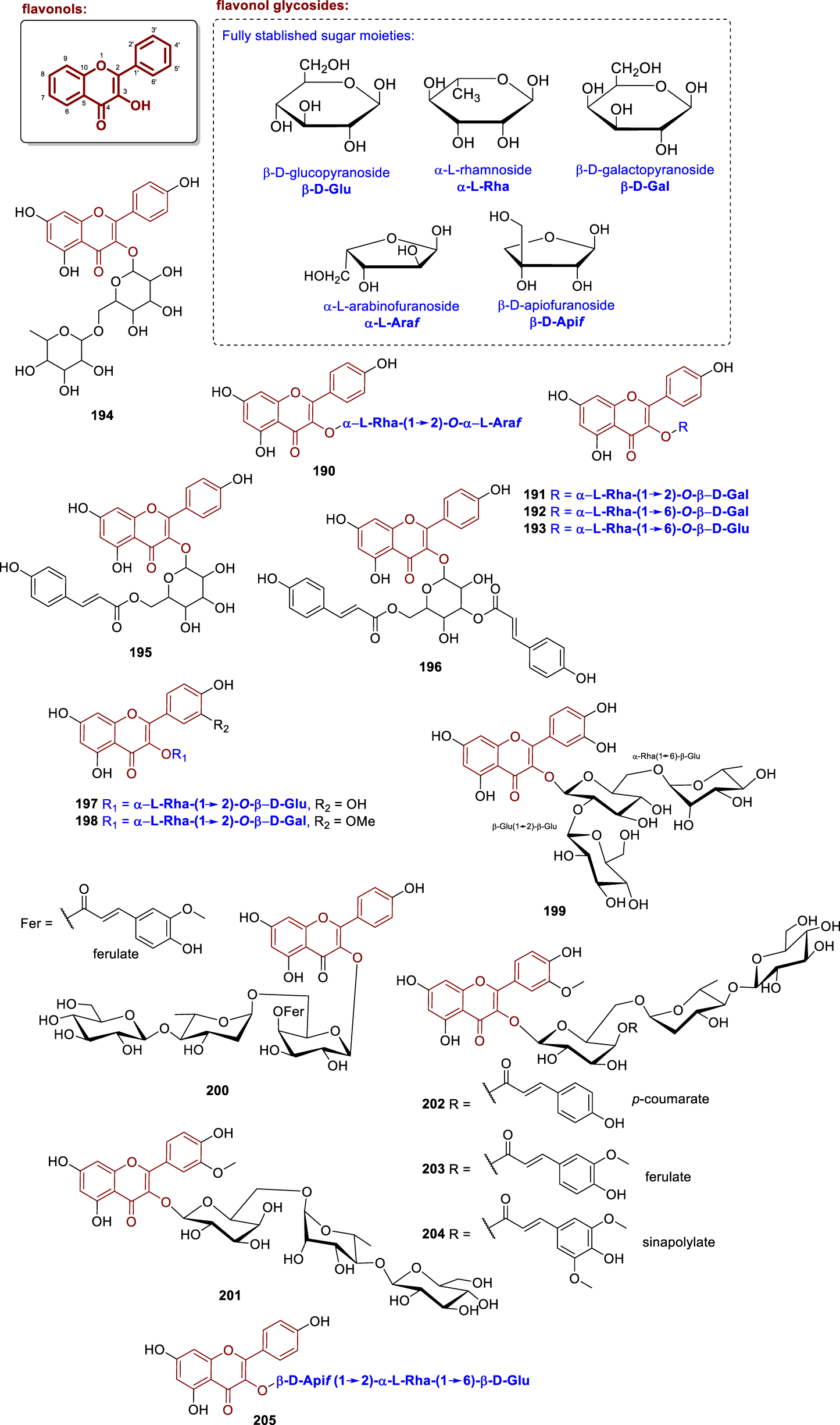 Chemical structures of flavonol glycosides isolated from Annonaceae (190–205).