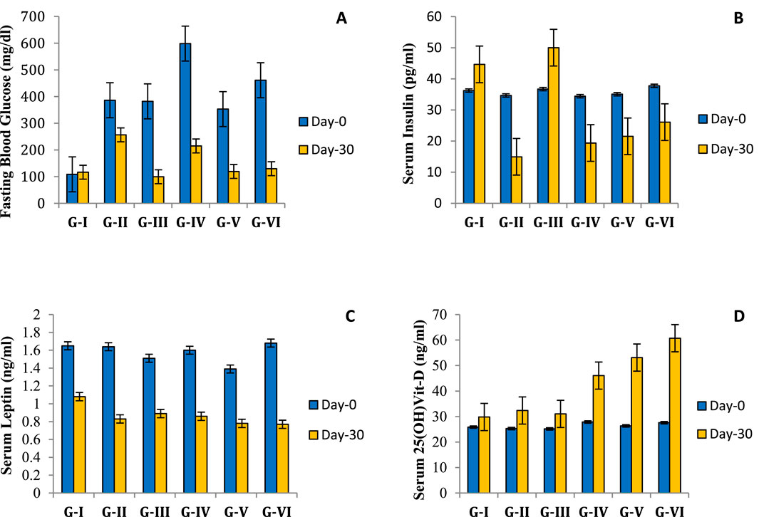 Figure 3. Effect of Tinospora cordifolia extract on hematological parameters of experimental groups. (A) Effect of Tinospora extract on fasting blood glucose (FBG); (B) effect of Tinospora extract on serum insulin; (C) effect of Tinospora extract on serum leptin; (D) effect of Tinospora extract on serum vitamin-D.