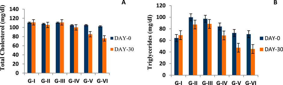 A significant decrease was recorded in the total cholesterol levels of G-IV, G-V, and G-VI animals receiving 100, 600, and 900 mg/kg wt TCE extract, respectively. However, neither of the group’s total cholesterol values reached >150 mg/dL during the entire experimental period (Figure 4A). The serum triglyceride levels showed a decreasing trend for all diabetic groups (Figure 4B). The maximum reduction of serum triglyceride was observed for 900 mg/kg wt (G-VI) of TCE. The HDL-cholesterol levels for each group were very low, and a non-significant increase was shown by the groups (G-IV, V, and VI) fed on Tinospora extract.