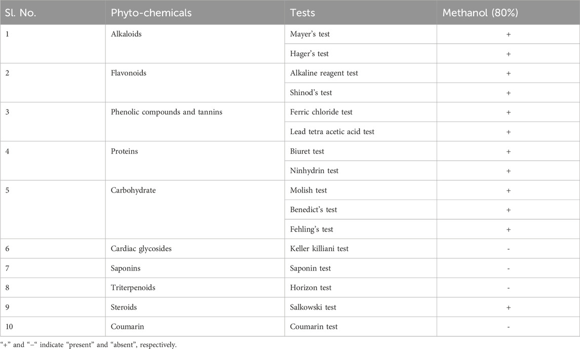 The phytochemical study of the methanolic extract of T. cordifolia stem revealed a broad variety of phytochemicals. The key phytochemical components, found in 80% methanol extract, were flavonoids, alkaloids, proteins, carbohydrates, glycosides, steroids, saponins, phenolic compounds, and tannins (Table 1).