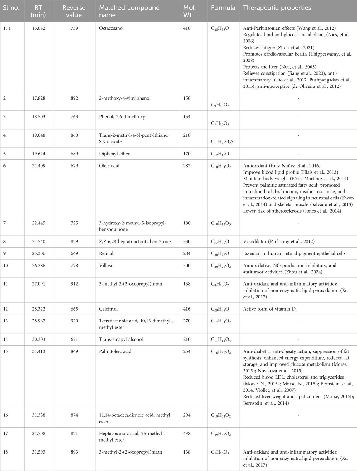 Table 2. List of phytochemicals with their retention time, molecular formula, molecular weight, and therapeutic potentials.