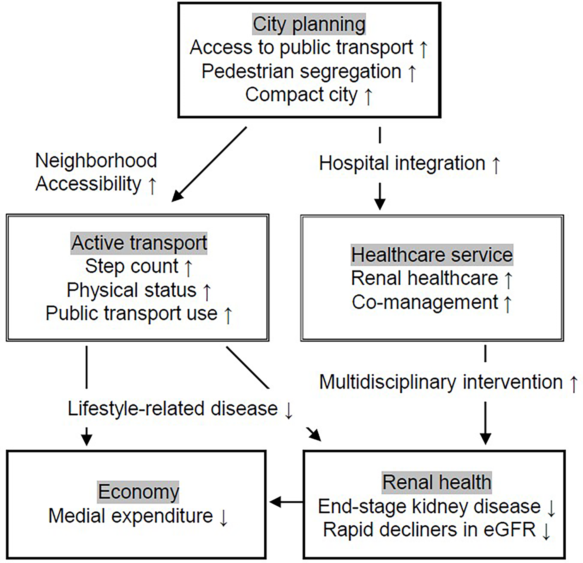 >Evaluating the monetary index has the potential to use market mechanisms to put pressure on companies and societies to change the policy of industry and city planning (32). Therefore, we describe the possible effects on the economy by city planning at the end (Figure 1). Even though social demonstration experiments on physical activity to attain better health are being conducted, they are only in limited areas and on a limited scale (33). While there have been many examinations of the economic benefits of integrating hospitals, few reports show the effect on prognosis for specific diseases. From this perspective, we have focused on the possible links between city planning and intermediate factors of developing CKD to improve renal health in Japan. Interventional investigations on physical activity and medical expenditure suggest that undergoing sufficient levels of physical activity is associated with decreased healthcare costs (33, 34). In the Japanese middle-aged population, a one-step-increase in the annual average daily step count reduced outpatient healthcare costs by 16.26 JPY in the short run and assumed long-run effects of daily steps were estimated at 28.24 JPY (33). Regarding preserving renal function and CKD deterioration, decline speed in eGFR is considered as a surrogate marker for ESKD. In the male general population, the annual costs for low eGFR subjects with a rapid decrease in eGFR (741 thousand JPY) were more than twice those of non-low eGFR subjects with a rapid decrease in eGFR (349 thousand JPY) and also larger compared to low eGFR subjects with a stable eGFR (336 thousand JPY) (35). We hope to maintain renal health by educating a wide range of people on the potential increase in financial burden that physical inactivity and regional disparities of renal healthcare that arises from inappropriate city planning.