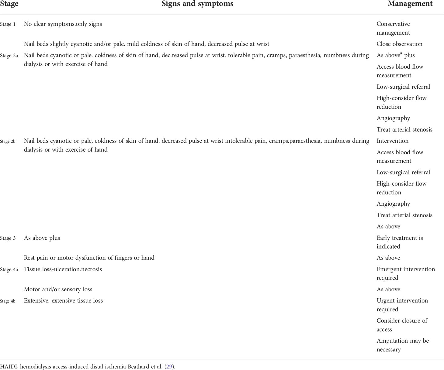 4) Hemodialysis access-induced distal ischemia (HAIDI), a challenging complication of AVGs and AVFs, is symptomatic extremity ischemia caused by the diversion of arterial flow through the access site. An incidence between 1 and 8% is reported; however, this number may not be accurate since there is a gamut of symptomatology that qualifies for the syndrome Table 1.