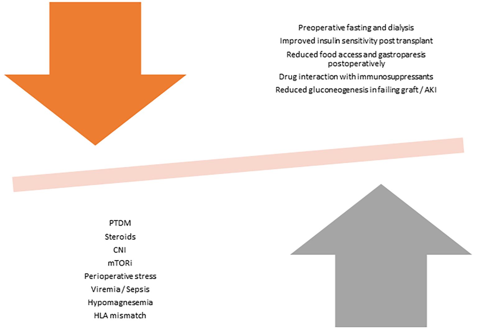 Non-pharmacological factors like surgical stress and pain can cause hyperglycaemia through secretion of cytokines and stress hormones that can affect insulin function (23). Improvement of kidney function in the post-operative phase improves insulin clearance, which may unmask preexisting hyperglycaemic tendencies (23). Acute or chronic hypomagnesemia, often seen in KT patients, has also been identified as an independent risk factor for PTDM through its role as an intracellular cofactor for glucose transport between membranes, glucose oxidation and insulin-mediated tyrosine kinase pathways (24). Asymptomatic Cytomegalovirus infection can cause impaired beta cell antiviral defence in the pancreas and increase risk of PTDM (25). Other transplant-related factors that increases risk of PTDM include male gender, HLA matching characteristics, hepatitis C infections and deceased donor kidney (16). Figure 1 demonstrate the competing influences of KT-related factors on hyperglycaemia and hypoglycaemia.