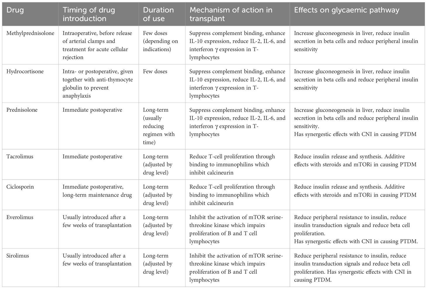 In experimental studies with mice, the administration of tacrolimus is associated with immediate impaired oral glucose tolerance test response, which indicate a propensity for postprandial hyperglycaemia (17). Methylprednisolone and prednisolone have a peak transient glycaemic action of 4–6 hours after administration, through the development of insulin resistance (18). Treatment with CNI and SGLT-2 may also predispose patients to diabetic ketoacidosis (DKA), even in those without a prior diagnosis of DM (19). Mammalian target of rapamycin inhibitor (mTORi), like everolimus and sirolimus, reduces peripheral resistance to insulin and insulin transduction signals leading to long-term dysregulated glucose control (20). The combination of CNI and mTORi is known to have a potent synergetic effect in the development of PTDM, compared to monotherapy (21). Similarly, steroids with CNI are also observed to have enhanced diabetogenic effects on patients (22). Table 1 summarises the effects of transplant medications on glycaemic control.