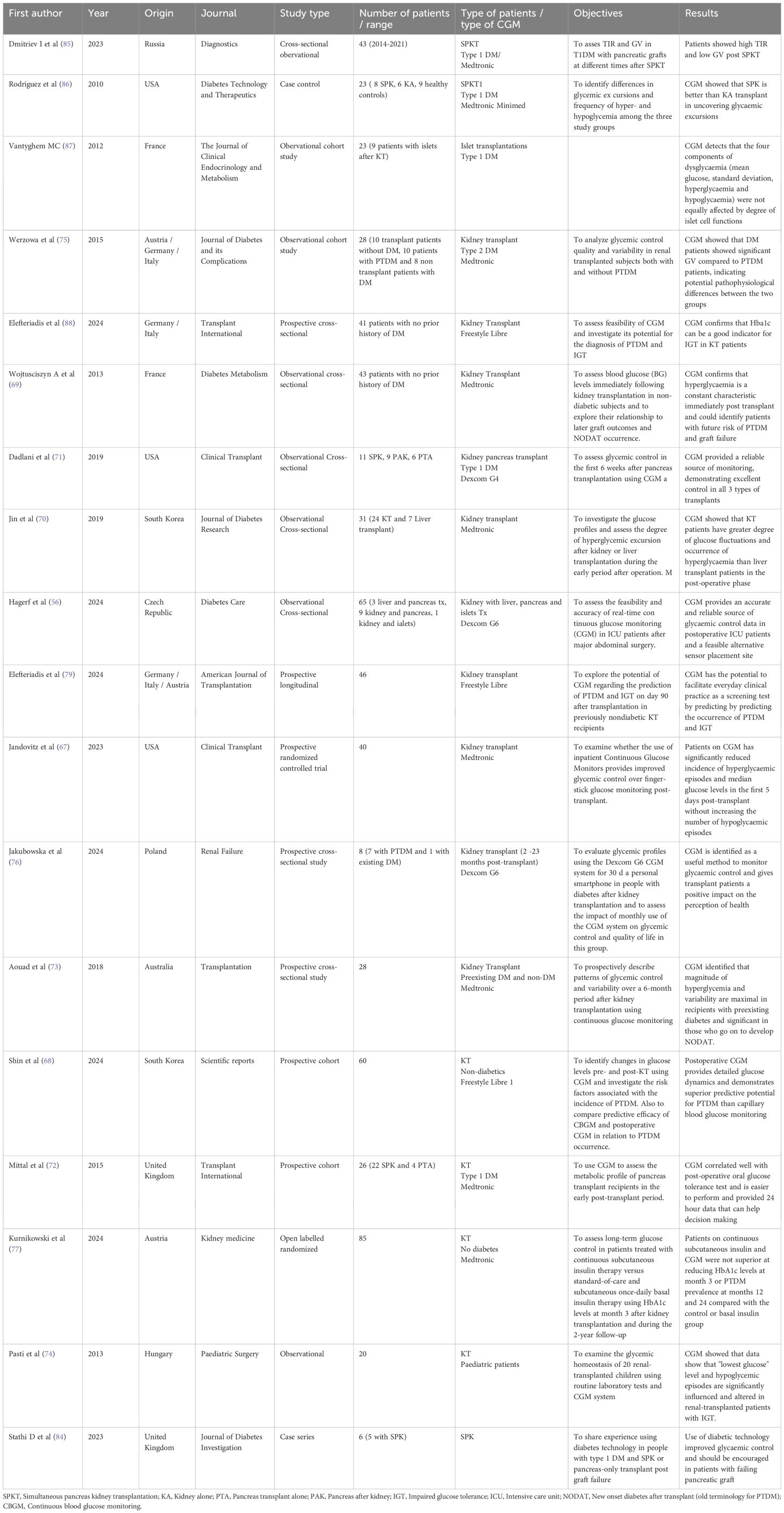 There is a paucity of published research on CGM usage in KT patients, with only 18 papers identified in the literature. (Table 2) (62, 75–85, 87, 94–98) More research in specific domains is needed to elucidate our understanding on this subject.