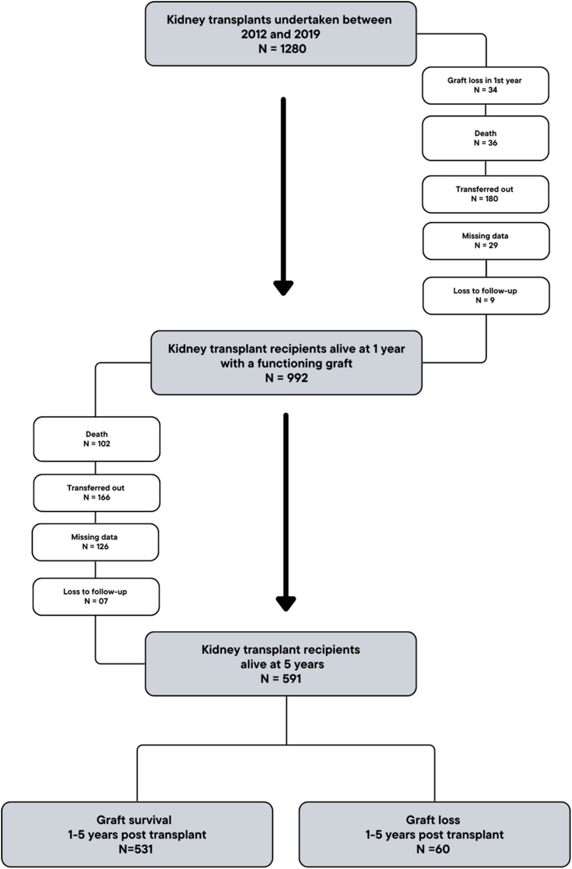 1280 patients underwent kidney-alone transplantation between 2012 and 2019, and 992 were alive and under active follow-up with a functioning graft at 1-year. Of these, 591 patients were alive and completed follow-up to 5 years, and were included in the analysis (Figure 1). 531 (89.8%) patients had a functioning graft (‘graft survival’ group) and 60 (10.2%) patients had graft loss (‘graft loss’ group) during post-transplant years 1-5.
