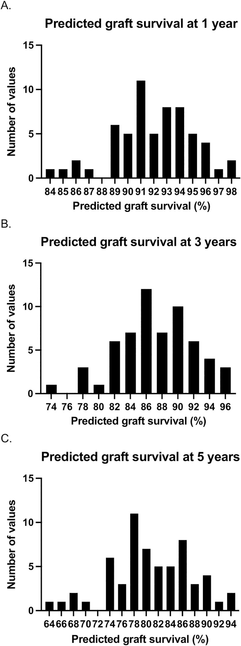 Figure 2. Predicted graft survival at 1- (a), 3- (b), and 5-years (c) post-transplant based on donor and recipient variables at the time of transplantation in those with early graft loss (between 1- and 5-years post-transplant). For each case, the prediction model determines the percentage of grafts that would be expected to be functioning at each follow-up timepoint. The histograms represent the number of cases with each graft survival prediction. For example, in 7 cases, it was predicted that 80% of grafts would survive to 5 years.
