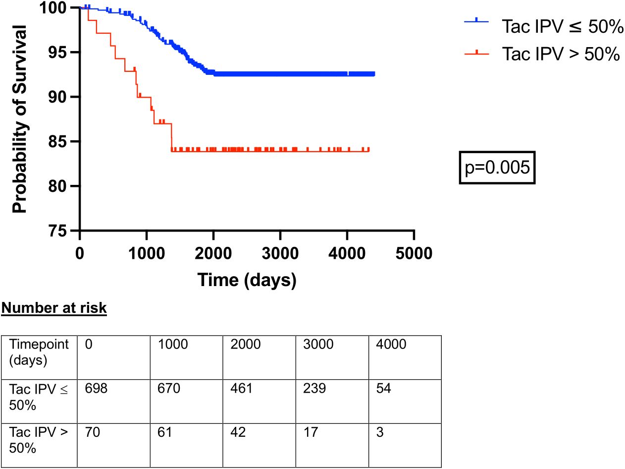 Figure 3. Death censored allograft survival in patients with tacrolimus IPV > 50% and ≤ 50% at 1 year post kidney transplant. Time 0 represents 1-year post-transplant. Curves compared with log-rank test.
