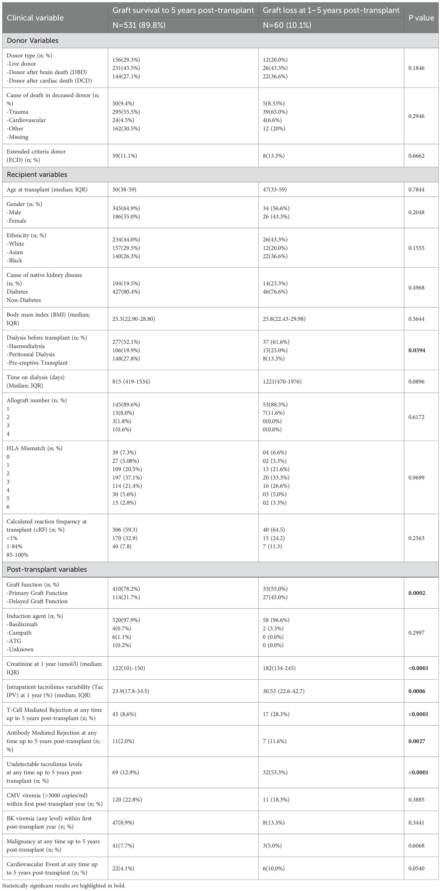 In the entire cohort, recipients were median age 50 (29-71) at the time of transplant, 379 (64.1%) were male, and 260 (44.0%) were of white ethnicity. 168 (28.4%) patients underwent living donor kidney transplant, and transplantation was pre-emptive in 156 (26.4%) cases. Table 1 outlines clinical variables in donors and recipients in patients with graft survival to 5 years and in patients with graft loss between 1- and 5-years. Patients with graft loss less commonly underwent pre-emptive transplantation, had higher rates of delayed graft function, serum creatinine and tacrolimus IPV were higher at 1 year, and there were more rejection episodes in this group.