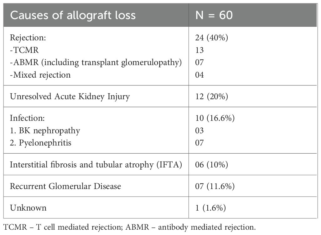 Table 2 outlines the primary causes of allograft loss in patients with graft failure between 1- and 5-years post-transplant. Alloimmune injury was the most common cause of graft failure, responsible for 24 (40%) cases. Of the 24 patients with graft loss due to rejection, 9 (37.5%) experienced an initial rejection event within the first post-transplant year (Acute TCMR = 5, Active ABMR = 2, mixed rejection =2) and 15 (62.5%) experienced their first rejection event at 1–5 years (Acute TCMR/mixed rejection = 8, Active ABMR = 1, chronic/chronic active ABMR = 6) (Supplementary Data Sheet 2).