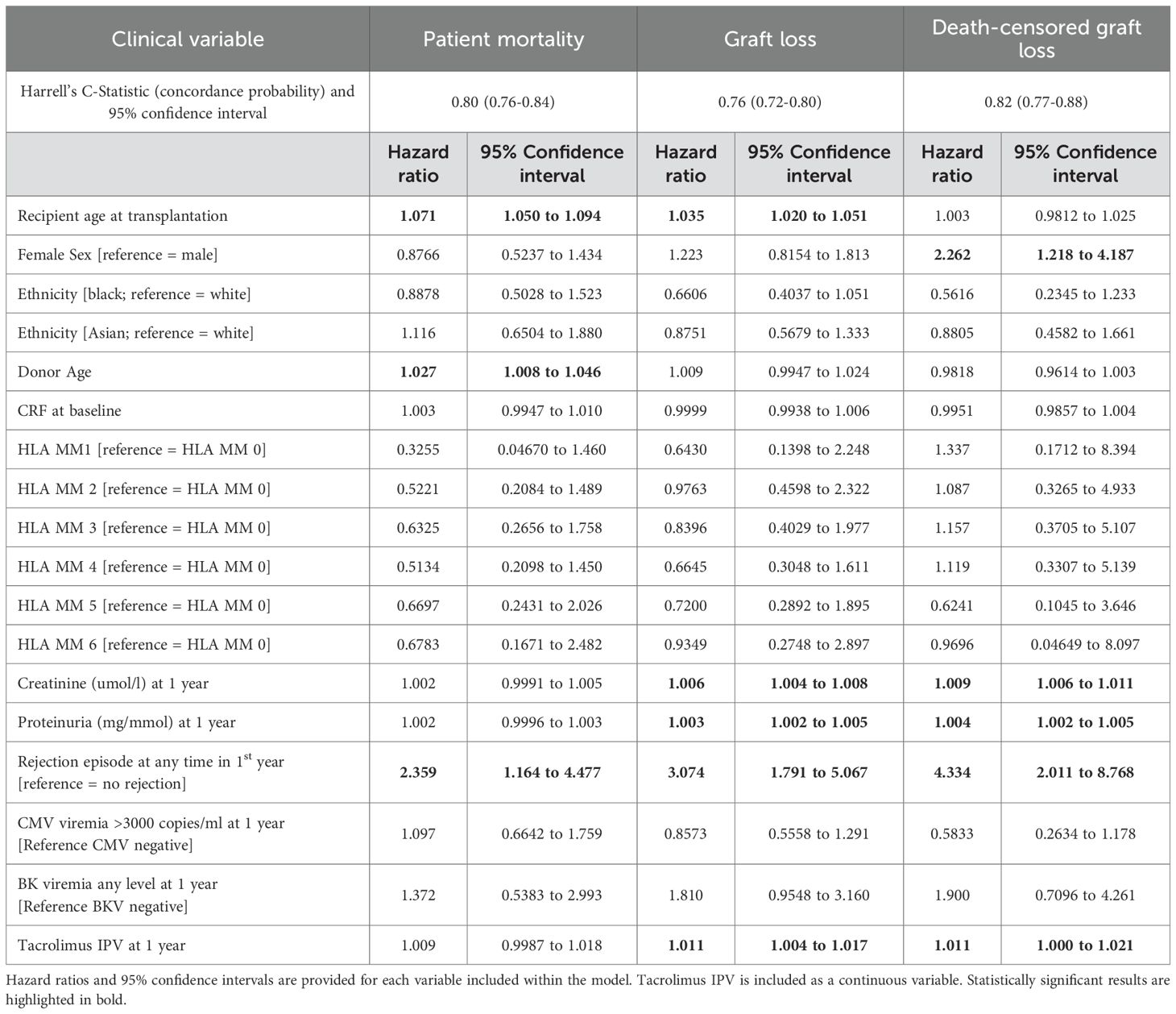 Data are reported as number and percentages for categorical variables, and mean and standard deviation (SD) or median and interquartile range (IQR) for numerical variables, depending on data distribution. Categorical variables were compared using the Fisher’s exact or Chi-squared test. Numerical variables were compared between two groups using the Mann–Whitney or an unpaired t test, and across greater than two groups with a one-way analysis of variance. Multivariable logistic regression was undertaken to determine clinical variables associated with graft loss at 1–5 years. Odds ratios (OR) and 95% confidence intervals (CIs) were determined for each variable. Demographic variables (recipients age, sex, and ethnicity), variables known to impact graft outcomes (type of transplant, HLA mismatch and levels of sensitisation), and variables not otherwise captured with a p-value of <0.05 in univariable analyses (pre-emptive transplant, delayed graft function, creatinine at 1 year, any rejection episodes, tacrolimus IPV, and undetectable tacrolimus levels) were included in the model. This analysis was undertaken in the initial cohort of patients with graft loss between 1- and 5-years and those with graft survival to 5 years. Multivariable cox regression analyses were undertaken to determine clinical variables associated with patient death, graft loss, and death-censored graft loss. Hazard ratios (HR) and 95% CIs were determined for each variable. Demographic variables (recipients age, sex, and ethnicity), variables known to impact graft outcomes (HLA mismatch and levels of sensitisation), and clinical variables recorded at 1 year (creatinine, proteinuria, tacrolimus IPV, and occurrence of rejection, CMV viraemia and BK viraemia at any time in the first year) were included in the models. We also explored a simpler model to determine variables associated with death censored graft loss incorporating creatinine and proteinuria at 1 year only, akin to the functional integrative Box (iBox) (22, 23). We did this with and without the inclusion of tacrolimus IPV and determined the concordance probability of each model using Harrell’s C-statistic. Analyses were performed using GraphPad Prism version 10 (www.graphpad.com). A p-value of ≤0.05 was considered statistically significant.