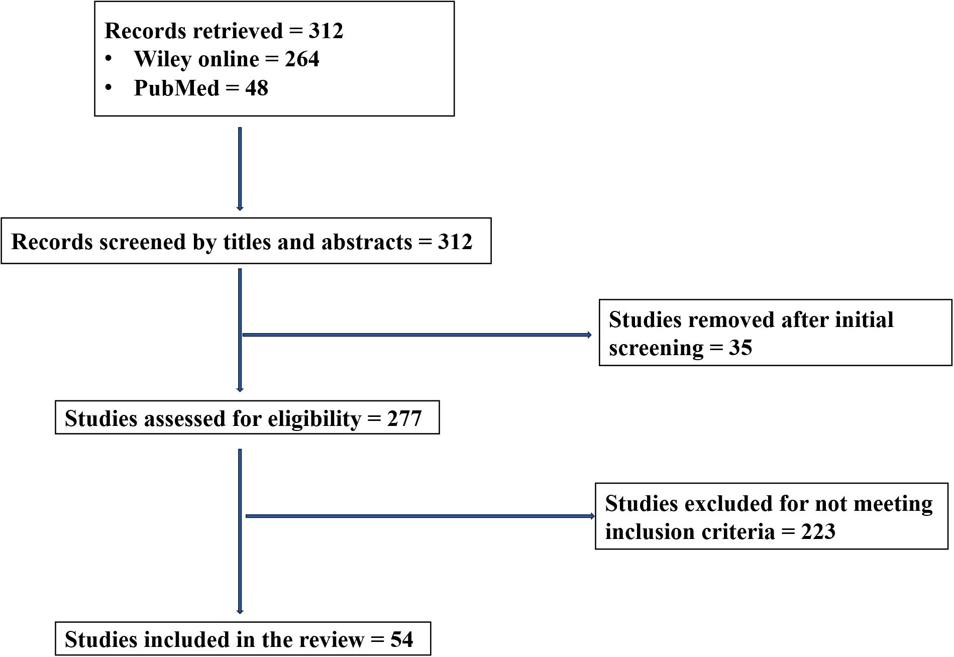 Flowchart detailing a study selection process. Records retrieved total three hundred twelve, sourced from Wiley Online and PubMed. After screening titles and abstracts, thirty-five are removed, leaving two hundred seventy-seven for eligibility assessment. Two hundred twenty-three are excluded for not meeting criteria. Fifty-four studies are included in the final review.