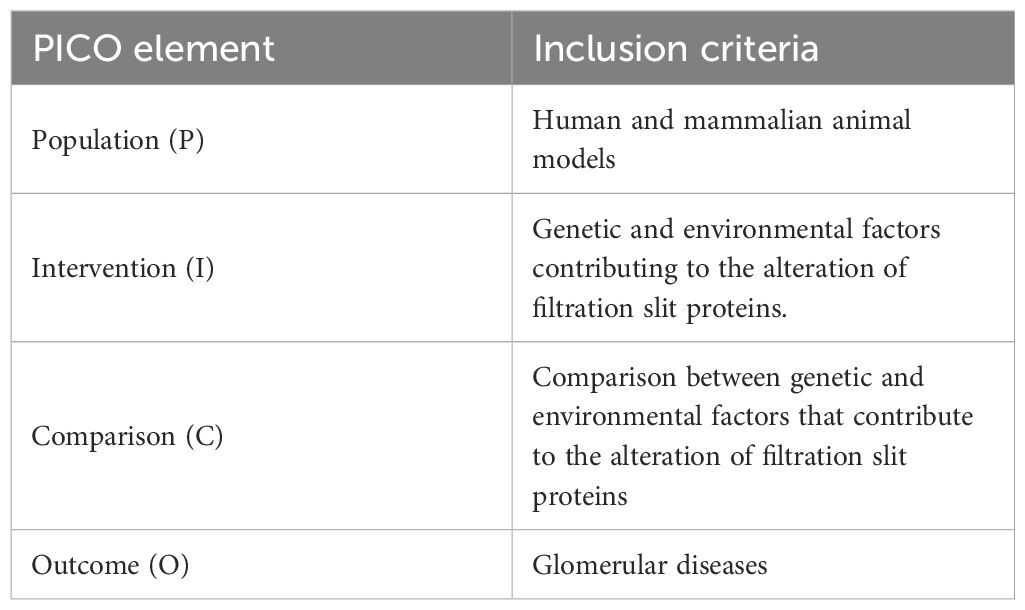 This scoping review adhered to the Preferred Reporting Items for Systematic reviews and Meta-Analyses-extension for Scoping Reviews (PRISMA-ScR) checklist as outlined by Tricco et al. (7) The review framework followed the six stages of scoping review (8) including: 1) formulating the research questions (Table 1), 2) identifying relevant literature, 3) selecting applicable studies, 4) mapping the data, 5) summarizing and synthesizing the findings, and 6) consulting experts. An electronic literature search was conducted primarily through the Wiley Online Library and PubMed to find peer-reviewed articles. The review focused on studies conducted across various continents: Europe, the Americas, Asia, and Africa. The search strategy employed a combination of controlled vocabulary and free-text terms, including phrases such as “slit diaphragm proteins”, “nephrin”, “podocin”, “P-cadherin”, along with “genetic alterations”, “environmental stressors”, “oxidative injury”, and related terms. Boolean operators (AND/OR) were applied to optimize search sensitivity and specificity. The search, conducted in April 2025, was confined to literature published between January 1995 and 31st March 2025, restricted to studies available in the English language, and focusing on both human and relevant mammalian animal models. The search strings for each database can be found in the Supplementary File S1.