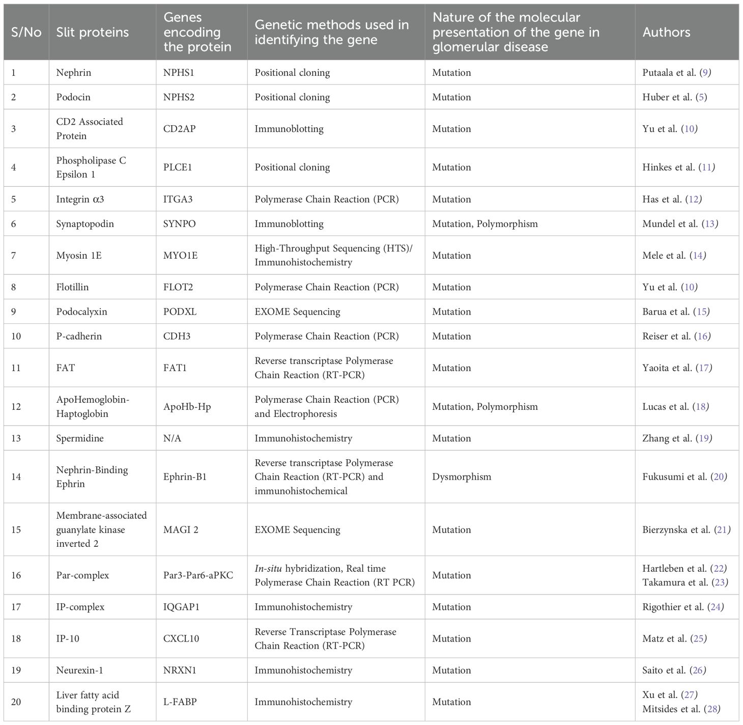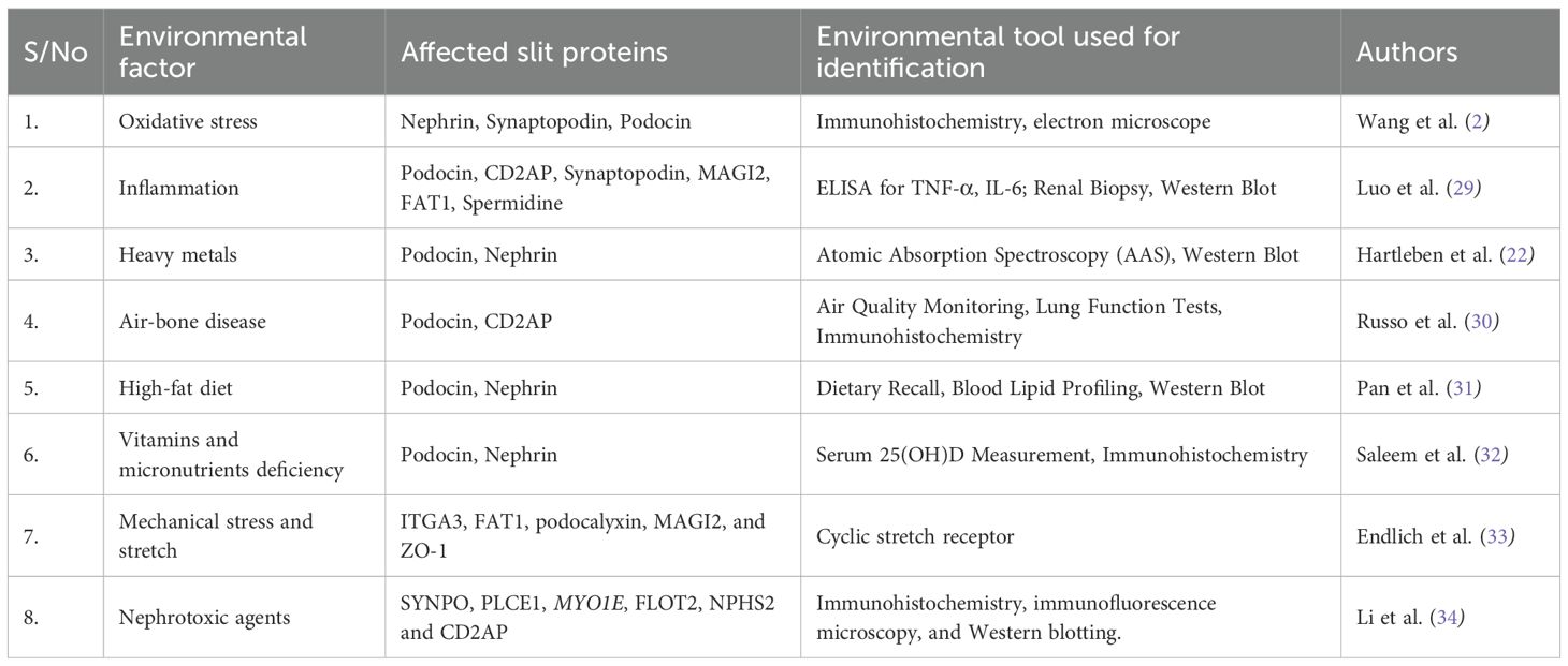 The number of known filtration slit proteins in humans is still expanding as research advances. Currently, at least 10–15 well-characterized proteins are essential for slit diaphragm integrity, while over 20 additional proteins have been identified as potential regulators or associated components. Some of these proteins include nephrin, podocin, phospholipase C Epsilon 1 (PLCE1); CD2-Associated Protein (CD2AP); ITGA 3, synaptopodin; NEPH-1, myosin 1E (MYO1E), flotillin-2 (Flot2), podocalyxin, FAT1, Apo Hemoglobin-Haptoglobin (Apo Hb-Hp), spermidine, P-Cadherin, ephrin B1, Zo- 1 (Zona Occluden), MAGI 1&2 (MAGUK inverted), Par- complex, IP-10 (interferon-inducible protein), neurexin 1, and liver type fatty acid binding protein. Herein, we present some of the genetic (Table 2) and environmental (Table 3) factors that are associated with the alteration in the structure and functions of these proteins.