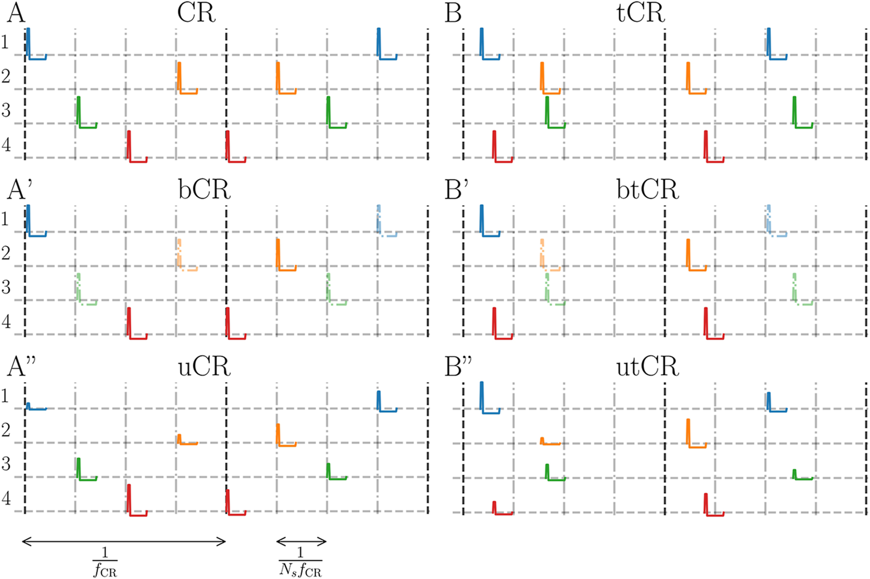 Illustration of stimulation patterns. (A): Regular CR stimulation for Ns = 4 subpopulations where the stimuli are delivered at integer multiples of 1/NsfCR (vertical dashed-dotted gray lines) with fixed stimulus amplitude Astim = 1. The vertical black dashed lines show the beginnings of new stimulation cycles. Colors indicate stimuli delivered to the same subpopulation (rows). A’: A representative bCR stimulation pattern where only a fraction of p = 0.5 of the stimuli is delivered. Stimuli that were removed (Astim = 0) are plotted translucently. A”: A uCR stimulation pattern. Stimulus amplitudes are uniformly distributed between Astim = 0 and Astim = 1 (see colored stimuli in panel A″). (B): tCR stimulation where stimulus times are uniformly distributed within CR cycles. Panels B′ and B″ show the btCR and utCR stimulation patterns with binarily distributed (B′) and uniformly distributed (B″) stimulus amplitudes, respectively. These patterns possess the same statistics of stimulus delivery times as the tCR pattern; however, for the btCR pattern only a fraction p = 0.5 of stimuli is delivered (removed stimuli are plotted translucently). For the utCR pattern, stimulus amplitudes are uniformly distributed in the interval Astim ∈ [0, 1].