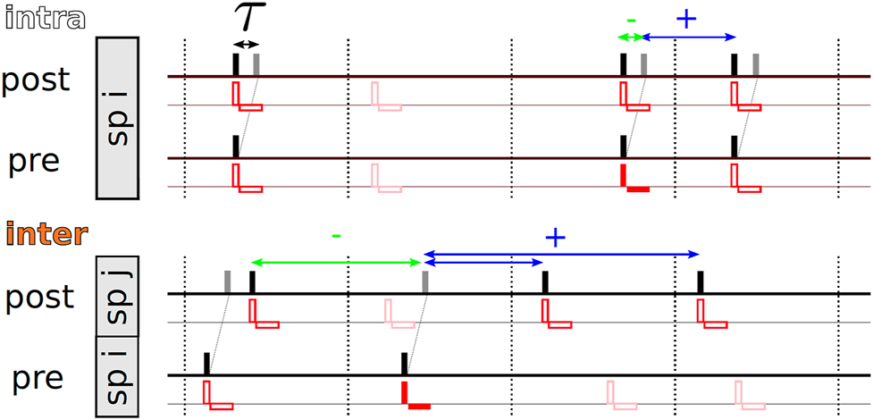 The mean rate of weight change is solely determined by the statistics of time lags, s, between stimulus deliveries to the presynaptic and postsynaptic neuron and are the distributions of time lags, s, that lead to positive (+) and negative (-) weight updates for intra- and interpopulation synapses, respectively, for the considered nearest-neighbor STDP scheme, see above. Negative weight updates result from pairings of delayed presynaptic spike arrivals with postsynaptic spikes triggered by the same (intrapopulation synapses) or the latest stimulus delivered to the subpopulation of the postsynaptic neuron (interpopulation synapses). Positive weight updates result from pairings of postsynaptic spikes with the latest delayed presynaptic spike arrivals caused by the latest stimulus delivered to the presynaptic neuron, see Figure 2.