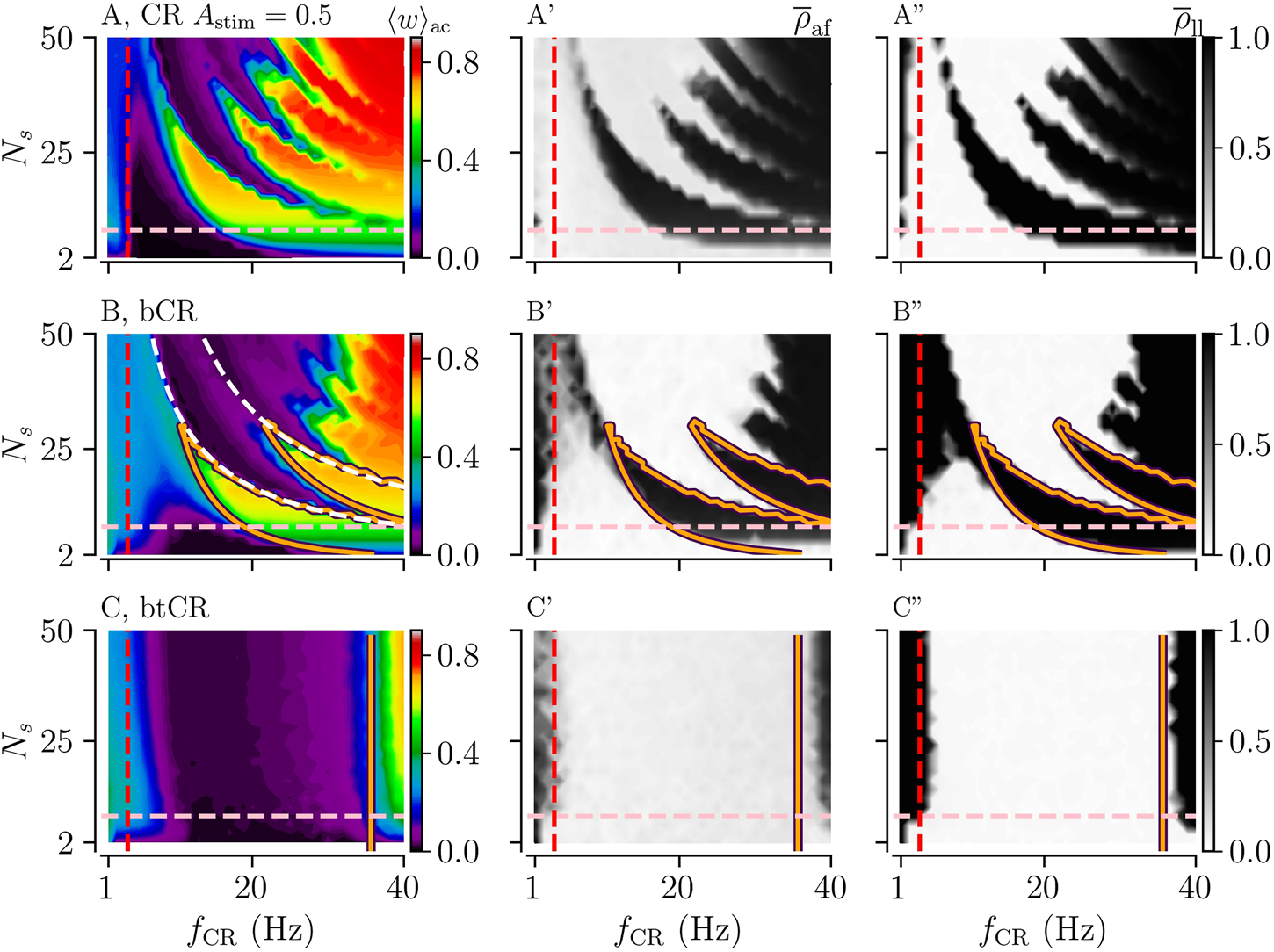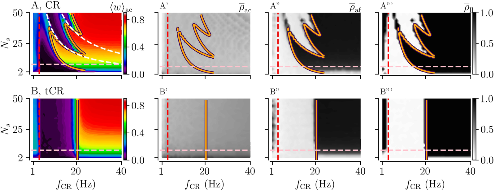 Acute and long-lasting effects of CR and tCR stimulation as a function of the stimulation frequency fCR and the number of subpopulations Ns. (A, B): The mean synaptic weight, ⟨w⟩ac, at the end of a 1,000 s stimulation duration for both CR (A) and tCR (B) stimulation. The orange curves show the zero-contour line of , Eq. 4, taken from Kromer et al. (2020). The white dashed curves in panel A mark the curves 1/NsfCR = τ and 2/NsfCR = τ. The former one marks the limit of the zeroth order approximation used for the calculation of and the latter one the limit of the first correction term. The vertical red dashed line marks the frequency of the underlying synchronous rhythm (≈3.5 Hz). The pink horizontal line marks the region of clinically relevant values of Ns⪅8, based on currently used DBS lead technology (Krauss et al., 2021). A′,B’: The acute after-effect on synchronization as quantified by the Kuramoto order parameter, , time-averaged over a 10-s interval after cessation of the stimulation. A″,B”: The long-lasting desynchronization effects quantified by the Kuramoto order parameter, , averaged over a 10-s interval 1,000 s after cessation of stimulation. Here the stimulation duration was set to Tstim = 1,000 s and Astim = 1. Note that results for CR were previously published in Kromer et al. (2020).