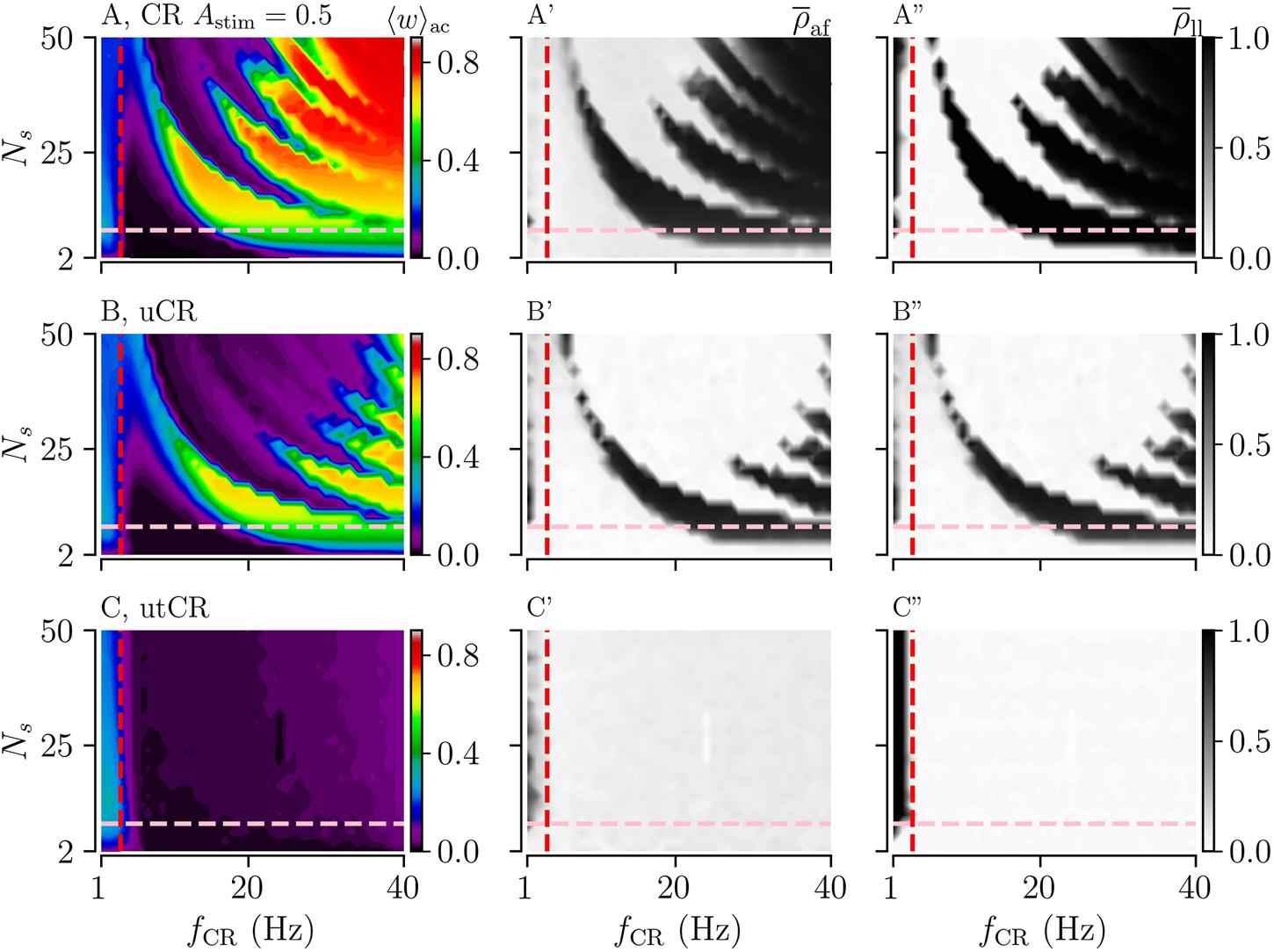 Acute and long-lasting effects of CR, uCR, and utCR stimulation with randomly distributed stimulus amplitudes (A,B,C): The acute mean synaptic weights, ⟨w⟩ac, at the end of the 1,000 s stimulation duration for CR (A), uCR (B), and utCR (C) stimulation. The vertical red dashed line marks the frequency of the underlying synchronous rhythm (≈3.5 Hz). The pink horizontal line marks the region of clinically relevant values of Ns (see caption of Figure 3). A′,B′,C′: The acute after-effect on synchronization as quantified by the Kuramoto order parameter, , time-averaged over a 10-s interval after cessation of stimulation. A″,B″,C″: The long-lasting desynchronization effects quantified by the Kuramoto order parameter, , averaged over a 10-s interval 1,000 s after cessation of stimulation. The stimulation duration was set to Tstim = 1,000 s.