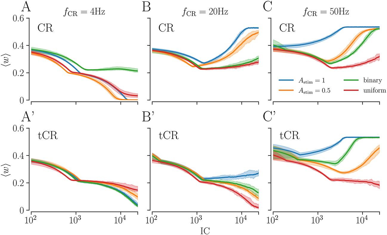 First, we consider the case of uniformly distributed stimulus amplitudes. Simulation results for uCR and utCR are shown in Figure 4. For both patterns, the overall mean stimulus amplitude ⟨Astim⟩ is 1/2. For comparison, we show results for CR with a constant stimulus amplitude Astim = 1/2 in Figure 4A.
