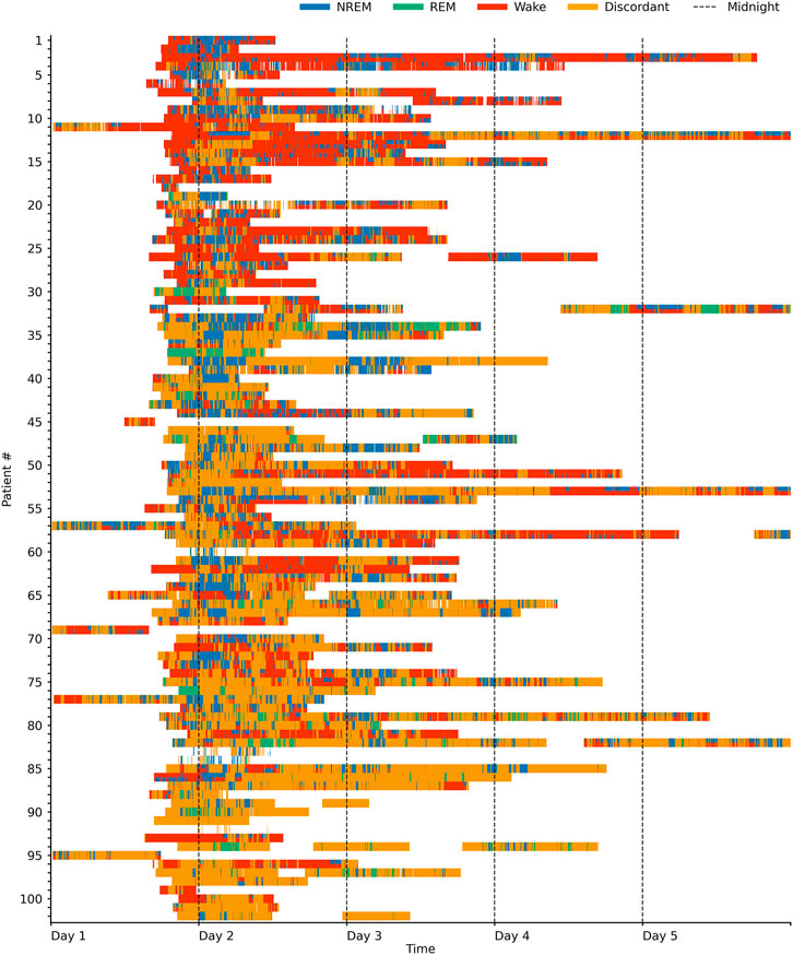 FIGURE 2. Sleep stages in the ICU over time. Swimmer plot visualizing sleep stages over time for 102 ICU patients. One line represents one patient, and patients are sorted by the proportion of sleep stage discordance (see main text for definition). For sleep epochs where HRV and breathing-based models were in concordance (60% of the data), the data is colored according to the sleep stages NREM (pooled N1, N2, and N3), REM and Wake as assigned by the breathing-based (top half of each line) and HRV-based (bottom half of each line) sleep staging models. Epochs where HRV and breathing-based models were discordant (40% of the data) are marked as orange. Both sleep stage distribution and the amount of discordance considerably varied among patients.