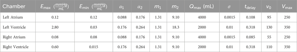 All parameters used in the model for the heart chamber, cardiac valve, and cardiovascular compartments (resistance, compliance) are chosen based on physiological values from Broomé et al. (2013).