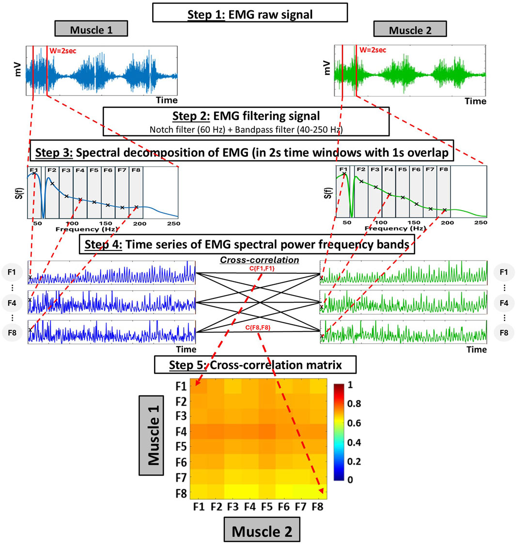 Figure 1. Schematic diagram representing the analyses for the global measures of inter-muscular coordination using the cross-frequency amplitude-amplitude coupling (ACFC) method. Step 1: Raw EMG signals are obtained from two different muscles over the same period. Step 2: Each signal is filtered using a 60 Hz Notch filter to eliminate power line interference and a bandpass filter (40–250 Hz). Step 3: Spectral decomposition is performed on each 2-s time window (with 1-s overlap), using 0.5 Hz bins within the 40–250 Hz range. To capture the specific contribution of different frequency bands, the resulting spectrum is divided into eight frequency bands of equal width (19.5 Hz), and the power within each frequency band is summed to obtain a single value per frequency band and window. Step 4: This process generates a time series of spectral power for each frequency band, sampled at 1-s intervals (i.e., 1s resolution). Bivariate equal-time Pearson’s cross-correlation are then computed at zero lag (no delay) between all combinations of frequency band time series from the two muscles. Step 5: This results in a 8 × 8 cross-correlation matrix (Ci,j) representing the coupling among frequency bands between the two muscles.