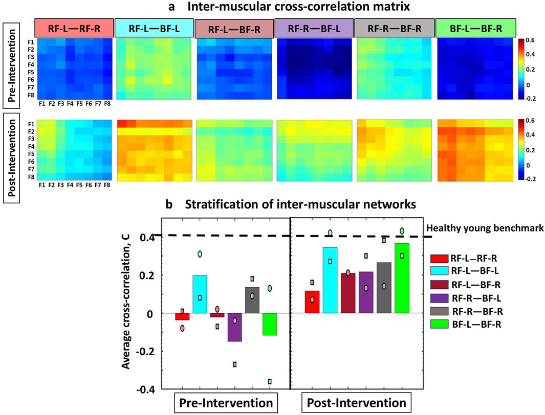 Figure 2 shows the inter-muscular cross-correlation matrices, illustrating group-averaged interactions from Participants 1 and 2. These matrices represent the correlations between the spectral power of eight frequency bands across all muscle pairs, both before and after the intervention. Overall, the Post-Intervention condition showed higher cross-correlation values among all sub-networks (pairs of muscles) in both participants. In Participant 1 (represented by a circle marker), the Post-Intervention condition resulted in marked increases in link strength between all sub-networks. Specifically, the RF-Left—RF-Right sub-network increased by ∼190%, RF-Left—BF-Left by ∼35%, RF-Left—BF-Right by ∼950%, RF-Right—BF-Left by ∼430%, RF-Right—BF-Right by ∼55%, and BF-Left—BF-Right ∼230%. Participant 2 (represented by a square marker) also showed marked increases in cross-correlation values after the Intervention. In this case, the RF-Left—RF-Right sub-network increased by ∼1500%, RF-Left—BF-Left by ∼240%, RF-Left—BF-Right by ∼400%, RF-Right—BF-Left by ∼210%, RF-Right—BF-Right by ∼110%, and BF-Left—BF-Right by ∼180% (Figure 2b).