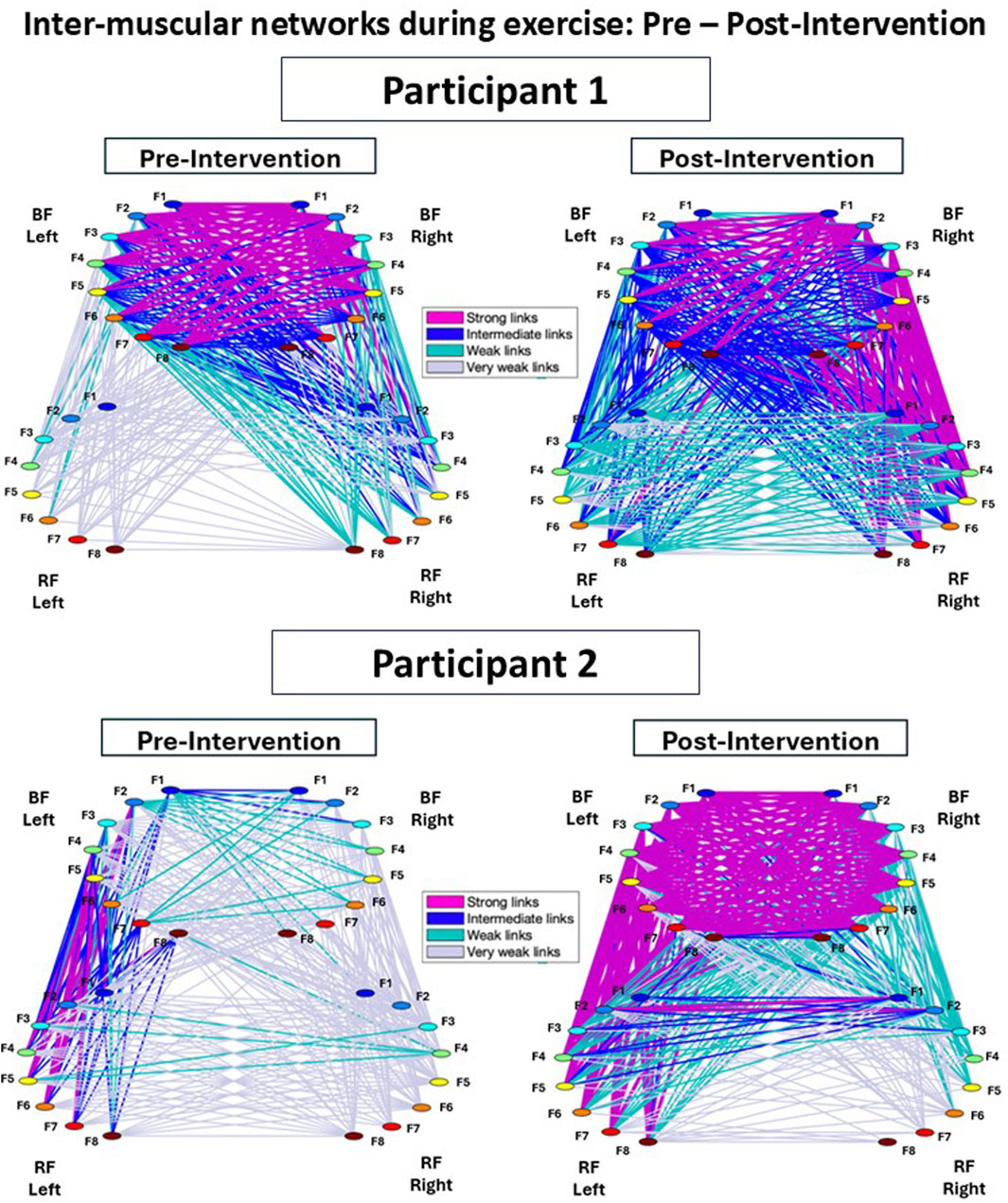The overall degree of link strength observed Pre-Intervention was low in both Participants across all sub-networks (RF-Left—RF-Right, RF-Left—BF-Left, RF-Left—BF-Right, RF-Right—BF-Left, RF-Right—BF-Right, and BF-Left—BF-Right), indicating a reduced level of synchronization between EMG frequency bands across muscles—which, in turn, suggests a low level of inter-muscular coordination across muscle fibers. These results are consistent with recent studies reporting diminished link strength in inter-muscular networks during exercise in older adults compared to younger individuals (Garcia-Retortillo et al., 2024). This reduction in inter-muscular coordination may be associated with age-related neuromuscular changes, such as sarcopenia, decreased number of larger motor units, reduced synaptic input, instability at the neuromuscular junction, or lower motor unit discharge rates (Hunter et al., 2016; Seidler et al., 2010; Serrien et al., 2000; Sun et al., 2016).