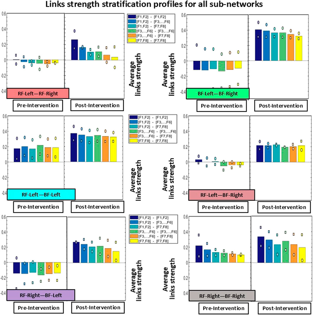 Figure 4. Stratification profiles of links strength for all inter-muscular sub-networks. Each stratification profile consists of six bars, representing the group-averaged links strength of all frequency band cross-correlation modules within a given sub-network. Individual participant values are indicated using distinct symbols (circle for Participant 1, and square for Participant 2). Notably, all modules across all sub-networks showed increased link strength Post-Intervention.
