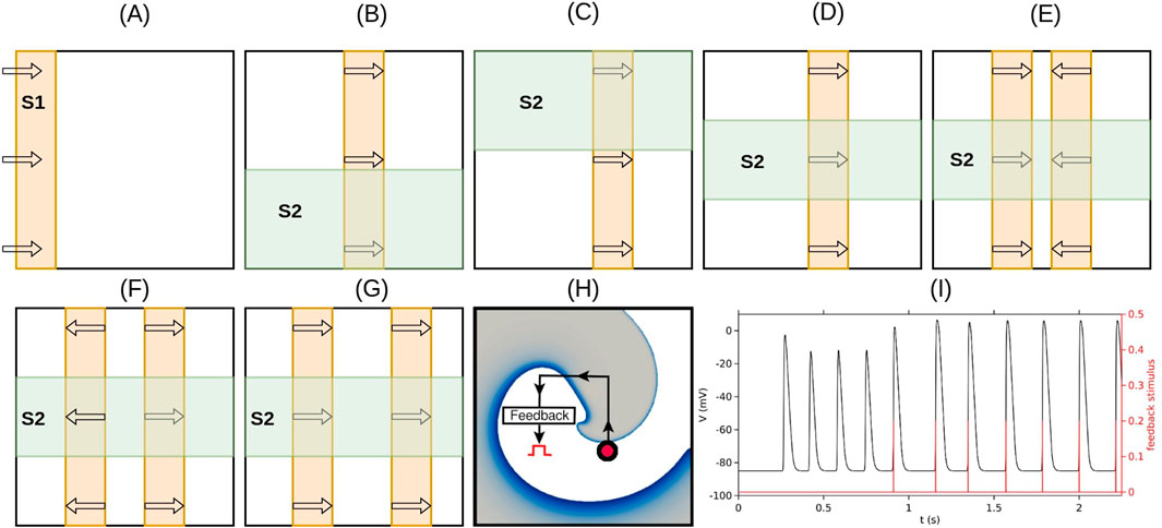Figure 1. Schematic illustration of the stimulation protocols used to generate various spiral wave patterns and provide feedback pacing. (A) Initiation of the S1 wave (orange) via a line stimulus applied along the left edge of the simulation domain. (B) S2 stimulus (green) applied to the lower half of the domain when the waveback of the S1 wave reaches the midpoint, resulting in a clockwise-rotating spiral. (C) S2 stimulus applied to the upper half of the domain at the same waveback position produces a counterclockwise-rotating spiral. (D) S2 stimulus applied over a rectangular region away from the domain boundaries produces a stable figure-of-eight pattern. (E) Protocol for generating four spiral waves (two face-to-face figure-of-eight patterns): two S1 waves are initiated simultaneously by applying line stimuli along both the left and right edges of the domain; the S2 stimulus is applied as in (D). (F) Protocol for generating four spiral waves (two back-to-back figure-of-eight patterns): a single S1 wave is initiated by applying a vertical line stimulus along the center of the domain; the S2 stimulus is applied as in (D). (G) Protocol for generating four spiral waves (two figure-of-eight patterns of the same chirality): two S1 waves are initiated sequentially by applying line stimuli along the left edge of the domain; the S2 stimulus is applied as in (D). (H) Schematic of the resonant feedback pacing (rF-ATP) protocol: the feedback point is marked with a red circle; each time the voltage at this point overshoots a threshold, a global stimulus is applied. (I) Voltage trace (black) and feedback stimulus timings (red) for a representative case of rF-ATP application.