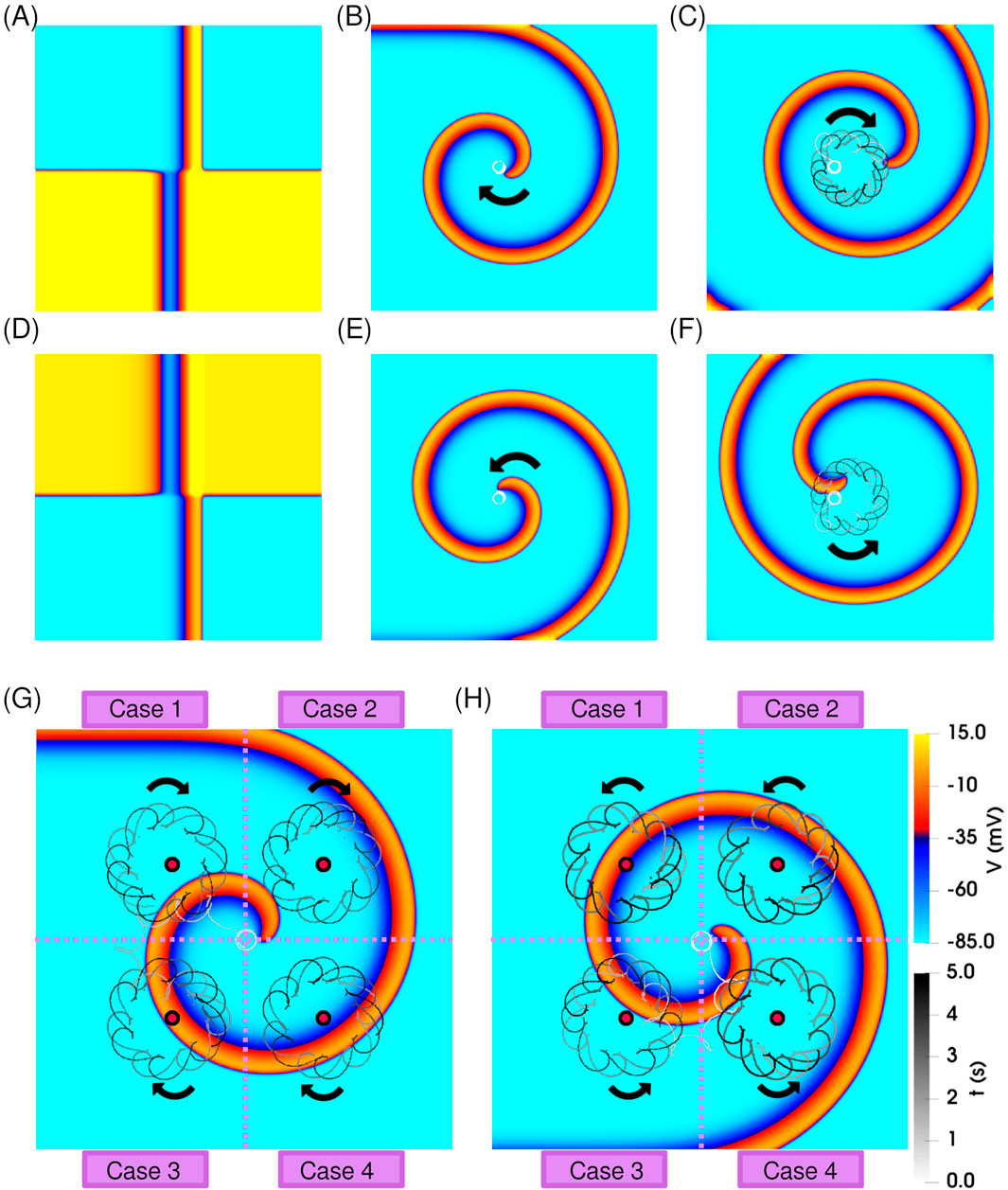 Figure 2. Dynamics of a single spiral wave in the absence and presence of resonant feedback antitachycardia pacing (rF-ATP). (A) Spatial distribution of transmembrane potential at the moment of S2 stimulation, producing a clockwise-rotating spiral wave. (B) Stable spiral wave observed after 5 s of simulation; the tip trajectory is overlaid in white, showing a circular path. (C) Application of rF-ATP using feedback from the geometric center of the domain results in spiral precession around the feedback site, forming an epicycloidal tip trajectory. (D–F) Corresponding results for a counterclockwise-rotating spiral: (D) S2 stimulation pattern, (E) stable spiral without feedback, and (F) spiral dynamics under rF-ATP, showing reversed epicycloidal precession. Dynamics of a single (G) clockwise-rotating spiral, and (H) counterclockwise-rotating spiral wave subjected to rF-ATP. Electrical signals were recorded from four distinct feedback sites (marked by red circles), each located in a different quadrant of the simulation domain. Regardless of feedback location, rF-ATP consistently induced spiral precession around the corresponding site, with the same sense of rotation relative to spiral chirality.