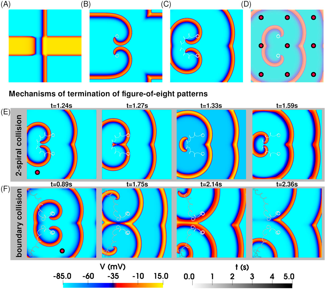 Figure 3. Application of rF-ATP to a pair of interacting spiral waves in a figure-of-eight pattern leads to termination. (A) Spatial distribution of transmembrane potential at the moment of S2 stimulation, producing a figure-of-eight pattern with two spirals of opposite chirality. (B) Stable figure-of-eight configuration, with each spiral tip tracing a circular trajectory. (C) Application of rF-ATP modifies spiral–spiral interactions, leading to termination—here via mutual collision and subsequent annihilation of the phase singularities. (D) Nine feedback points (marked by red circles) used to test the rF-ATP protocol on the same initial figure-of-eight pattern. In all cases, termination occurred via one of two mechanisms illustrated in (E) and (F). (E) Termination via mutual collision of the two phase singularities: Representative case in which rF-ATP induced mutual attraction between the spirals. (F) Termination via collision of each phase singularity with the inexcitable boundary: Representative case in which rF-ATP caused the spirals to repel each other.