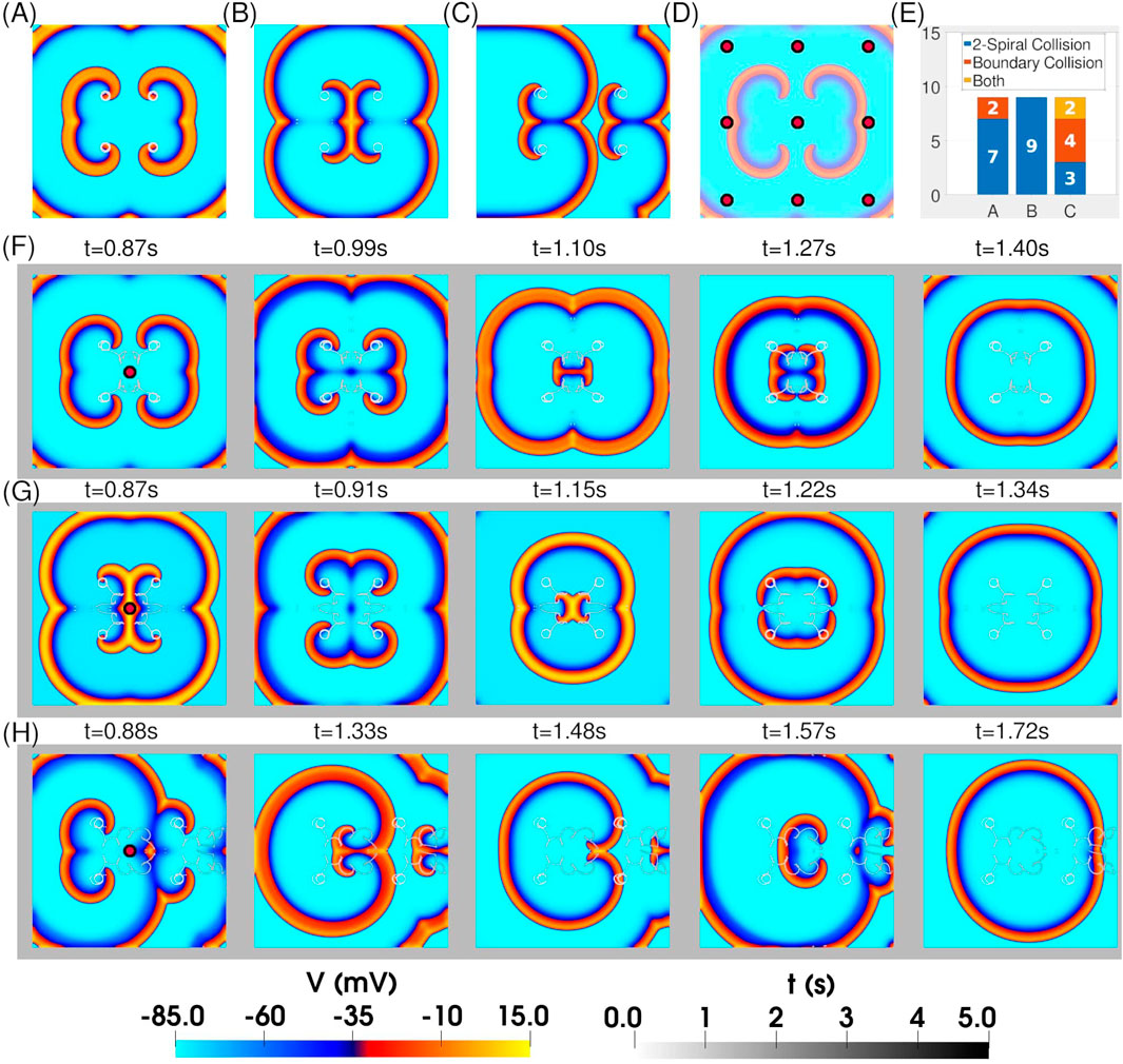 Figure 4. Application of rF-ATP to two weakly interacting figure-of-eight patterns leads to termination. Spatial distribution of transmembrane potential after stabilization of two figure-of-eight patterns that (A) face each other, (B) are back-to-back, and (C) are positioned side-by-side. In each configuration, the individual spirals exhibit stable circular tip trajectories in steady state. (D) Locations of nine feedback points used in separate simulations for each 4-spiral configuration in (A)–(C) to test for positional bias of the protocol. (E) Statistics of figure-of-eight termination via the two mechanisms described in Figure 3. (F–H) Representative spatiotemporal evolutions of the patterns in (A–C) when feedback is extracted from the geometric center of the domain. In all cases, rF-ATP leads to figure-of-eight termination via annihilation of mutually colliding phase singularities.