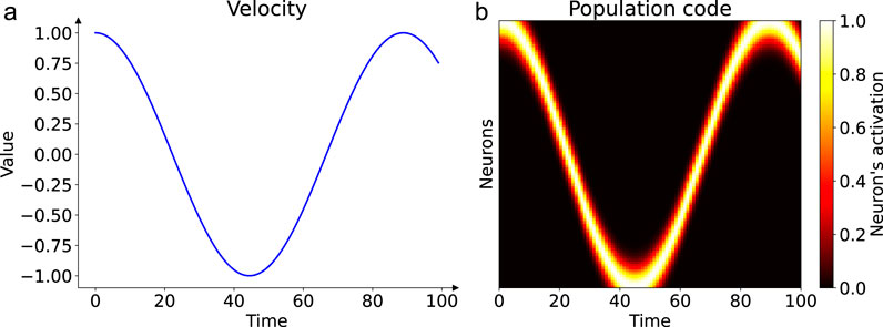 Figure 1. Population coding of a dynamic input signal. Panel (a) shows an example of a time-varying velocity signal, here one period of a sinusoid, presented to the network over time. Panel (b) illustrates how this scalar profile is encoded as a spatiotemporal activity pattern across the input neuron population. Each neuron (y-axis) is tuned to a preferred velocity. As the input velocity changes over time (x-axis), the peak of the activity bump shifts across the population, creating a dynamic representation of the signal shown in (a).