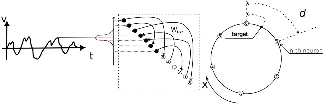 In our discrete-time simulation, this integral is approximated using a second-order Euler method. During training, this serves as the supervisory signal. The “target neuron” refers to the output neuron whose preferred position