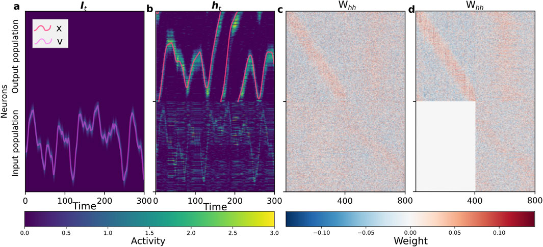A successfully trained network exhibits clear functional specialization, as shown in Figure 3. While the input population activity directly mirrors the incoming velocity signal (Figure 3a), the output population integrates this signal to maintain a stable, localized bump of activity representing the agent’s angular position (Figure 3b). This functional division is a direct result of the self-organized recurrent connectivity matrix (Figure 3c), where the output-to-output block