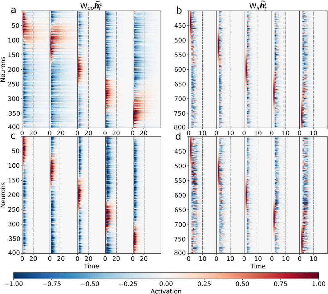 Figure 4. Autonomous dynamics reveal functional specialization of input and output populations. To test the intrinsic properties of the learned modules, we simulated their autonomous activity driven only by their internal recurrent connections (i.e., without external input or inter-population signals). Each population was initialized with five distinct Gaussian bumps of activity. (a,c) The output populations exhibit transiently persistent activity, maintaining the bumps for an extended period before eventually decaying to the zero state. This demonstrates a clear memory-like capability, essential for integration. Notably, the persistence in the fully connected network (a) is significantly more robust, sustaining the localized activity much longer than in the feedforward-only network (c). (b,d) In sharp contrast, the input populations from both the fully connected network (b) and the feedforward-only network (d) show dissipative dynamics, where the initial activity bumps decay rapidly. These simulations correspond to evolving the activity according to (Pouget et al., 2000; Hafting et al., 2005).