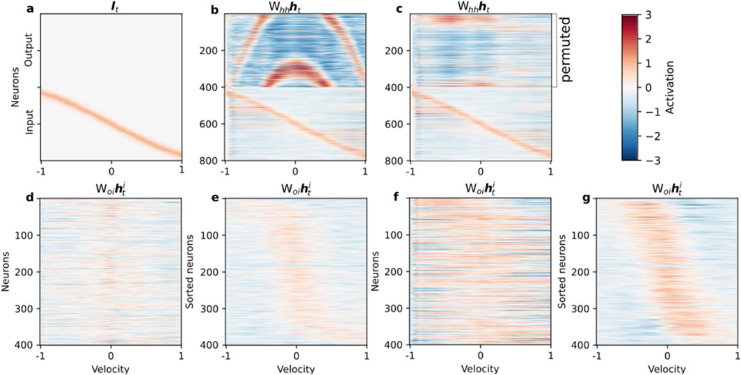 As illustrated in Figure 5b, a properly trained network successfully integrates the velocity ramp (Figure 5a). However, network performance collapses when the population code-to-ring mapping is disrupted by permuting the output neurons (Figure 5c), confirming that the encoded structure and network topology must remain aligned for successful integration. The output population in the unperturbed circuit receives a smoothly propagating population control signal, but this signal can no longer synchronize correctly with a shuffled arrangement, revealing the codependency of circuitry and coding motif.