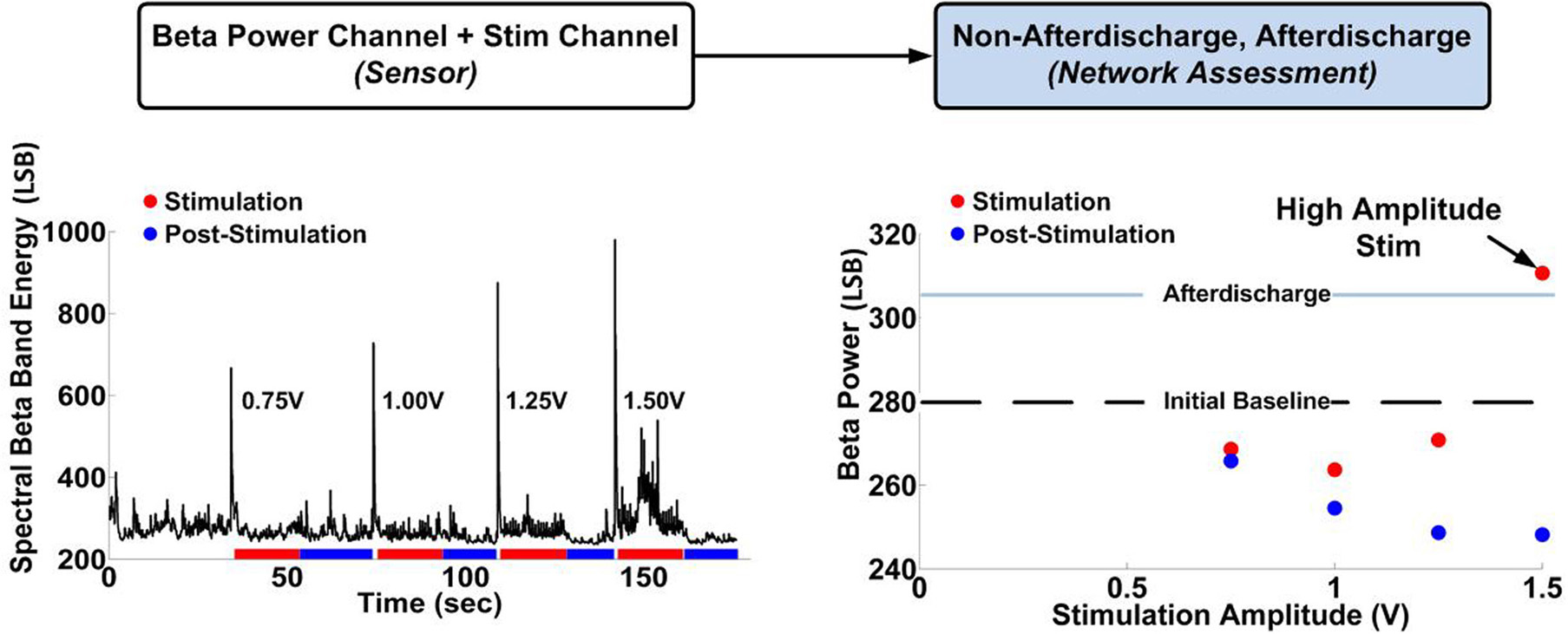 8, right). To determine whether the network was truly suppressed, we performed a second series of transfer function experiments which measured the pre-stimulation baseline beta band power level followed with a high amplitude delivery (≥1.50 V) “probe pulse” capable of inducing AD. Because our experimental setup was not a seizure model, we used the post-stimulation AD duration as the desired output for assessment of network effect. Through spectral analysis of the data, we observed a potential control variable in the 20 ± 2.5 Hz band (approximately the beta band) that seemed correlated to the qualitatively observed states: