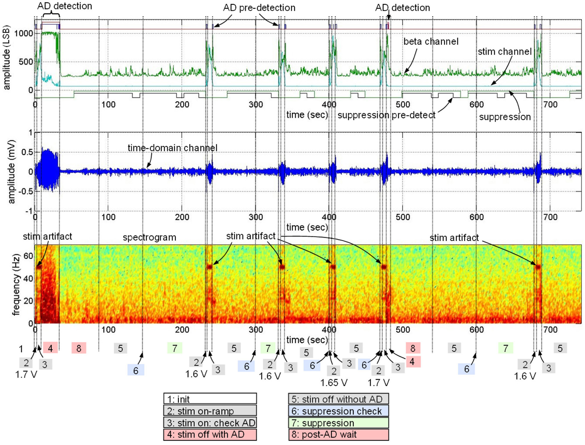 The final embedded algorithm implemented three sub-algorithms into a single-state machine: AD detection and mitigation; suppression detector; and parameter search. The code was then downloaded to the device through wireless telemetry, error checked for complete flash writes, and the implant was then activated with the closed-loop algorithm. All states were exercised in the algorithm routine to validate operation. State transitions were also recorded in the device data records for automated annotation of files, allowing for observational validation and algorithm refinement.