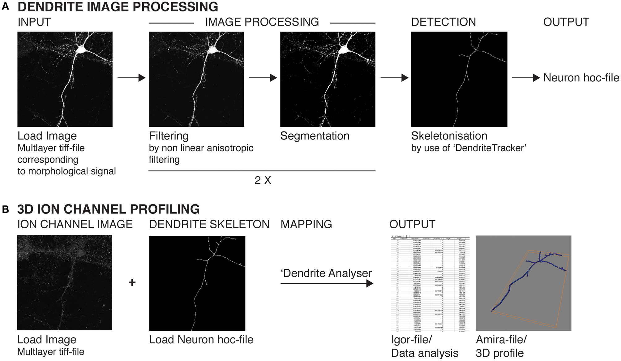 Schematic representation of the major steps involved in image processing, skeletonization, and ion channel profiling analysis. (A) Images stacks pertaining to neuronal morphology data (eGFP or mCherry expression) are subjected to two sequential rounds of filtering and segmentation analysis using custom-written algorithms Anisofilter and Segment. Skeletonization is performed using DendriteTracker. The resulting output (in hoc format) can be visualized using Neuron. (B) The image stacks corresponding to ion channel signal are then subjected to 3D profiling analysis using the custom-written algorithm DendriteAnalyser. The dendritic skeleton (Neuron hoc-file) serves as reference for the 3D coordinates for fluorescent intensity calculations. The resulting analysis is written to Amira mesh and Igor Pro wave format. All confocal images stacks are converted to multi-layer tiff-files in 8-bit format prior to analysis.