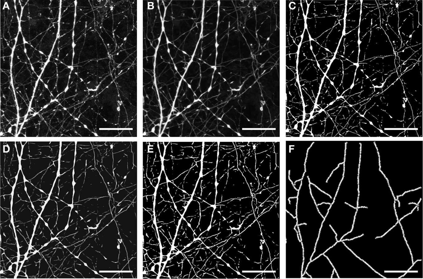 Representative example of outcome of the different steps in dendrite image processing. (A) Raw data—image stack corresponding to morphological structure (in this case resulting from eGFP expression). (B) The same image stack following filtering; (C) filtering and segmentation; (D) filtering and segmentation, followed by a second round of filtering; (E) two sequential rounds of filtering and segmentation. Images shown in (A–E) are z-projections calculated from all focal planes. (F) Image after skeletonization of resulting segments [from data shown in (E)]. Scale bar, 10 μm.